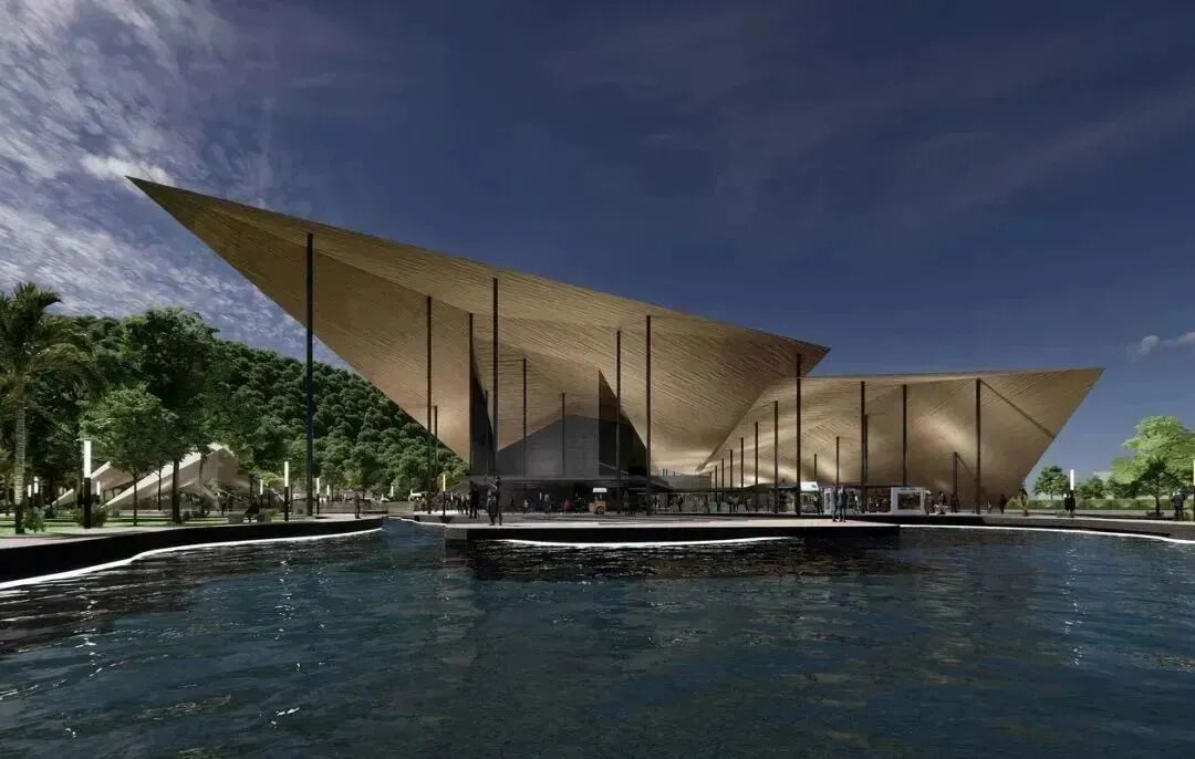 在尊重原水景环境、园林建筑,遵循餐饮建筑的设计原则下,采用湿地公园的建造方式,以“廊桥”和“步道”实现各个功能区的连接。建筑主要以钢架结构搭建,而外立面设计源于蚝壳,运用仿生的手法打造出蚝壳的肌理,使建筑与原生态环境融为一体。