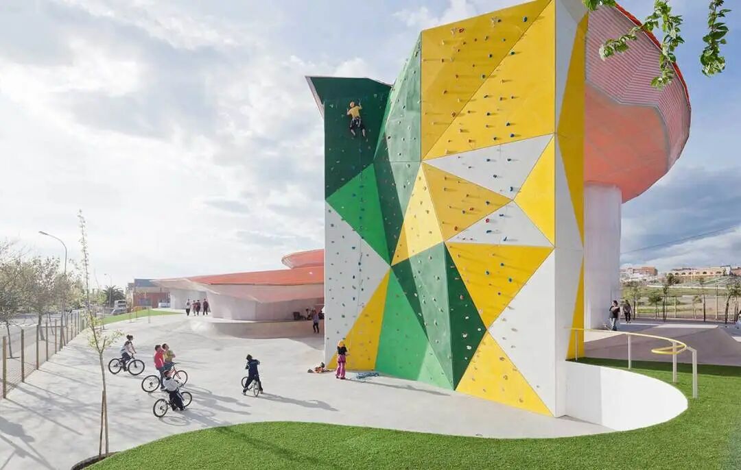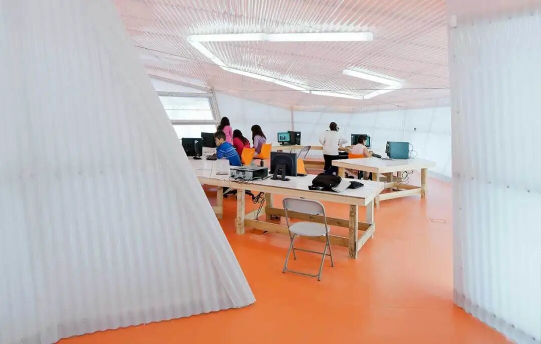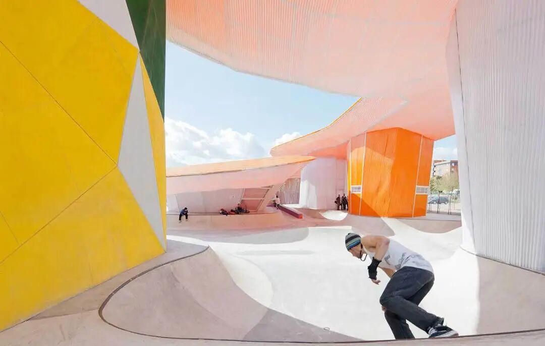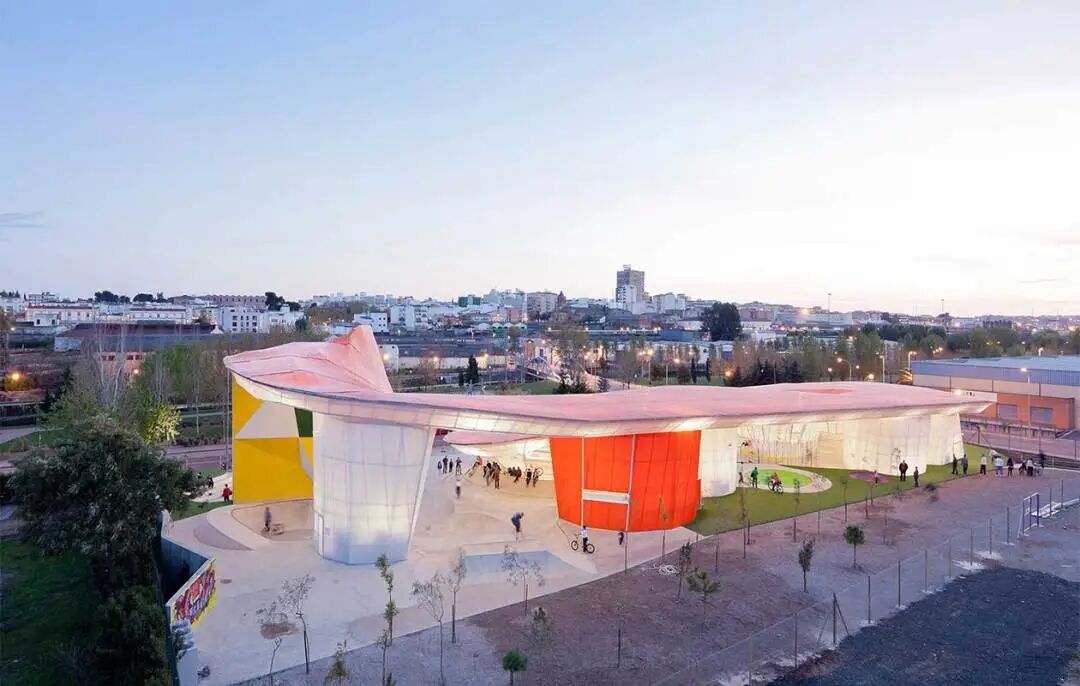 梅里达青年工场将许多公众活动集结在一起,人们能在这里攀岩,宽带上网,涂鸦,画画,演戏,马戏,走钢丝,做录像艺术,玩音乐,搞艺术,跑酷,视听,跳当代舞,嘻哈,玩滑板和极限自行车。建筑师尽可能的让其不存在过滤性,即允许所有可能的人进行所有可能的活动。同时建筑有一个大的顶棚,在下面有不同的功能区。像气垫似的一米厚的顶棚可以防晒防雨,调节气温,避免空调的使用。整个屋顶就像是一片大云,具防护性,半透明性。最高处是攀岩墙,表面同样做了三维化处理。这个顶篷依靠在椭圆形支撑周围的钢柱上,直到最高处,在那里连接着用相同的三维网格制作的攀岩墙结构。整个部分建在一个五英尺高的地库上,这样梅里达市敏感的历史性罗马基地就不会被破坏。