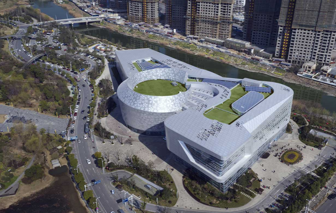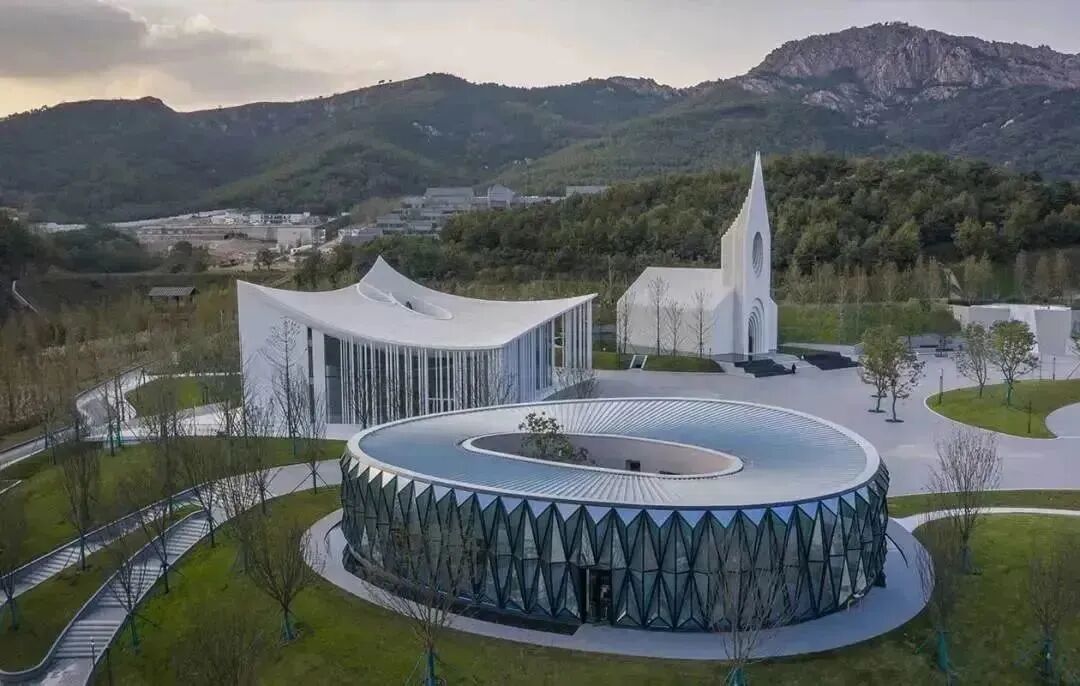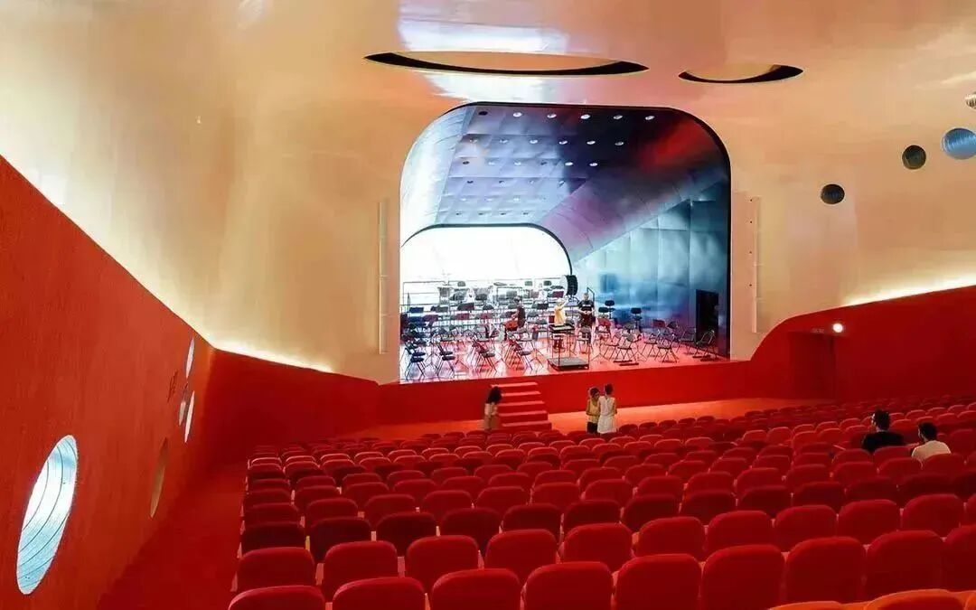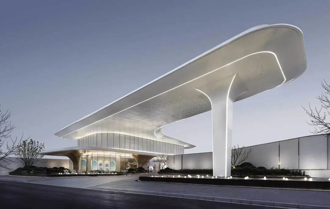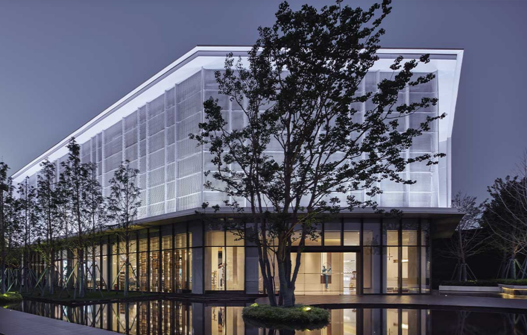 视觉上将梅花、纸灯笼、花格窗等传统元素作为设计灵感,起伏转折的主体建筑形态宛如从大地生长的蜿蜒的梅枝,而圆形音乐厅似乎是梅枝上盛开的梅花,又仿佛是传统纸灯笼的抽象与变形。音乐厅立面采用不同穿孔率铝板形成错落有致的南京市花梅花图案。