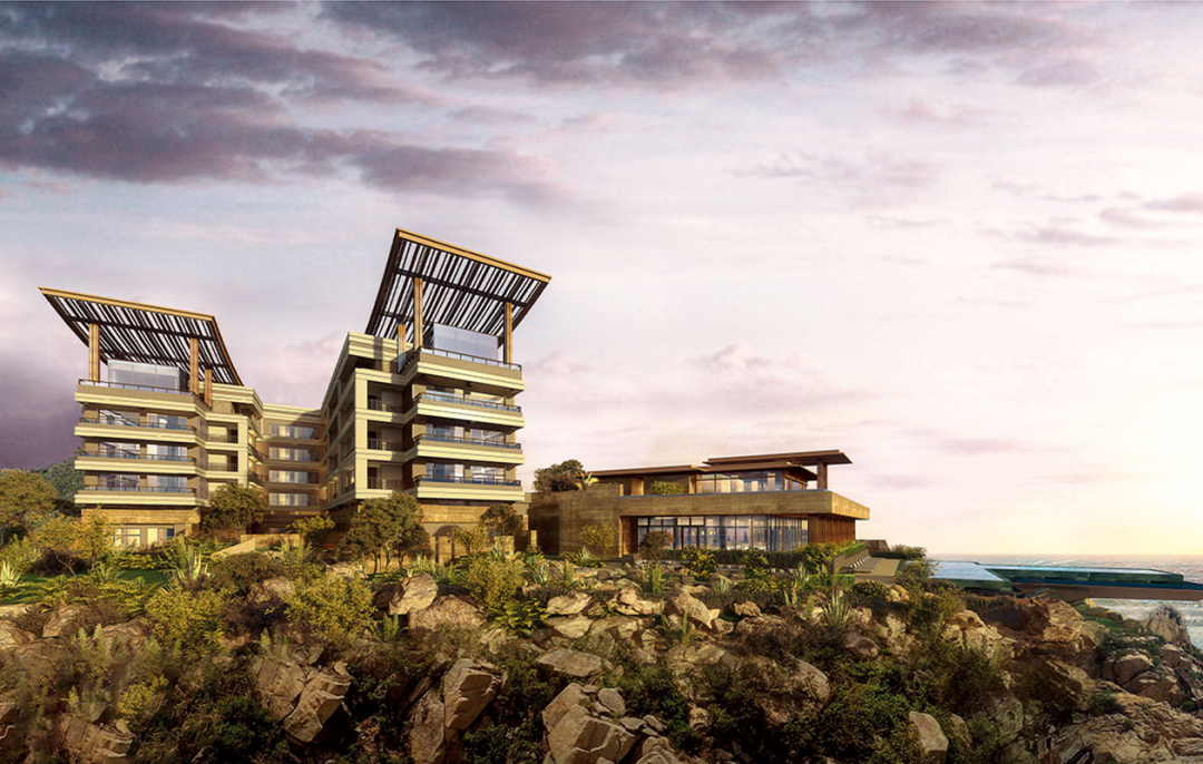 她坐落于东澳岛最南端岛尖悬崖之上,具有山石般沉稳的建筑主体和海浪般的悬浮顶冠造型。秉承尊重自然的设计原则,建筑对于突兀的酒店客房体量进行巧妙处理,两条略带分角的平行线条好似劈开的山石,俯瞰前冲入海的动感造型呼应着岩石与大海碰撞的激情与冲动。
