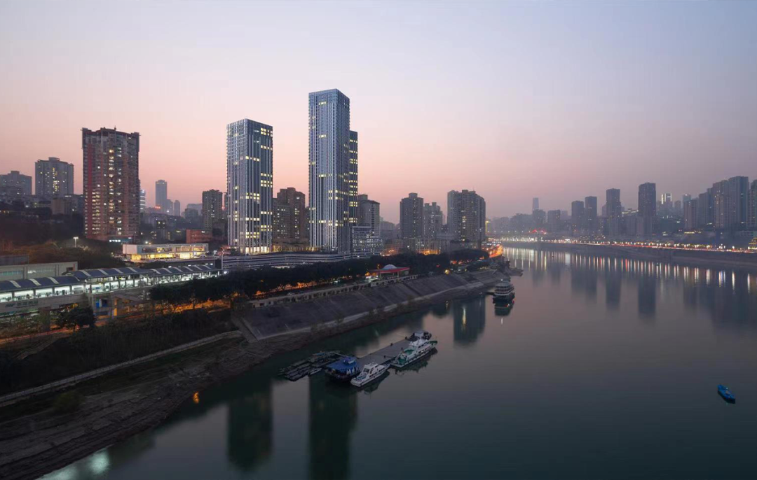 我们把重庆的“山水”映在建筑外墙,让建筑与所在环境发生对话,彼此关联。塔楼建筑立面以纵向的白色金属线条与蓝色玻璃幕墙为主要元素,通过构成设计,形成高低错落的城市滨江天际线,呼应重庆山谷形象。而底层裙房则通过江水般柔和的曲线,将几个不同形式的建筑体量连接起来。这些体量在平面上逐步退台,为人们提供一系列的观景平台的同时,也避免庞大的建筑体量对周围带来压迫感。