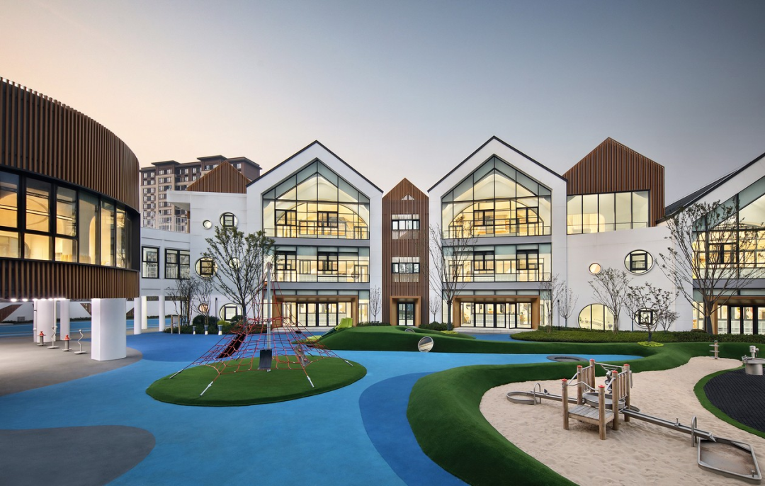 设计师以基本规整又相对灵动有韵律的庭院为设计母题,以江南建筑元素为设计手法,打造地标性的幼儿园社区。在规划上着重发掘其自然风景条件并结合气候条件,充分利用周边环境优势,同时营造活泼的园内环境,做到内部景观与外部环境和谐、自然与人工连贯的整体性规划,提升教育用地的价值及教育环境的趣味性与品质,并做到可持续性发展。