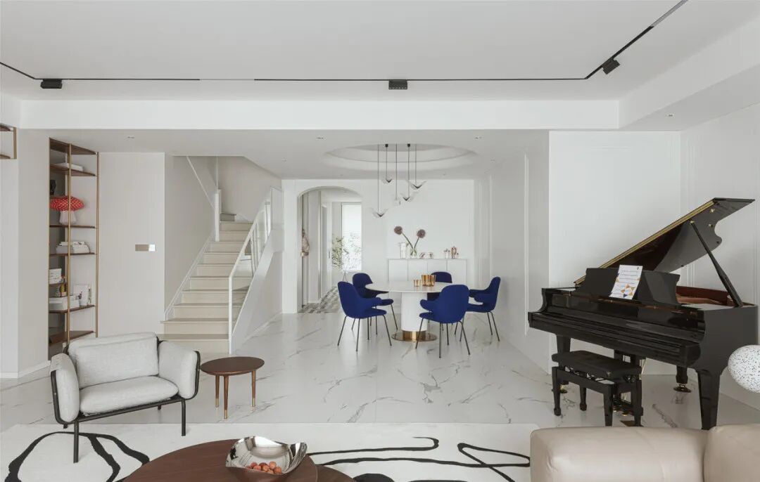 装材质以浅色木质、白色大理石、瓷砖为基调,体现化繁为简、至拙至美的设计理念,利用极简的线条和形状,搭配浅淡的中性色,抛去所有冗余元素,创造一个通透简单和谐舒畅的空间,让空间拥有整齐划一的美感,通过多种材质的交替转换,使偏平化空间展现更深层的美感。