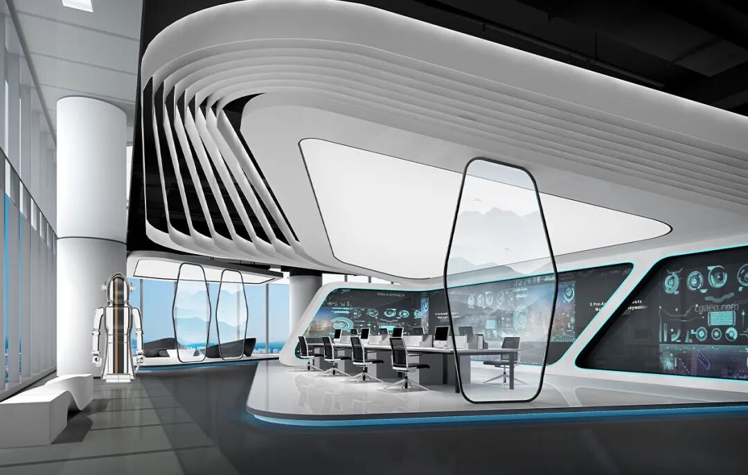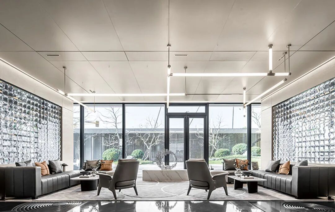 融入“未来科技感办公”,数字化为灵感来源,将其富有科技的现代美感进一步提炼升华,转化为新的设计语言,注入到金融中心的办公大楼设计中。办公空间以白色调为主,大堂立面的白色玻璃、天花白色铝板,形成强烈的视觉冲击,同时以充满张力的线条,连绵的黑色科技,营造出高端、科技、时尚的未来办公氛围,塑造空间生命力,也凸显荣民集团蓬勃向上,富有创造力的企业精神。