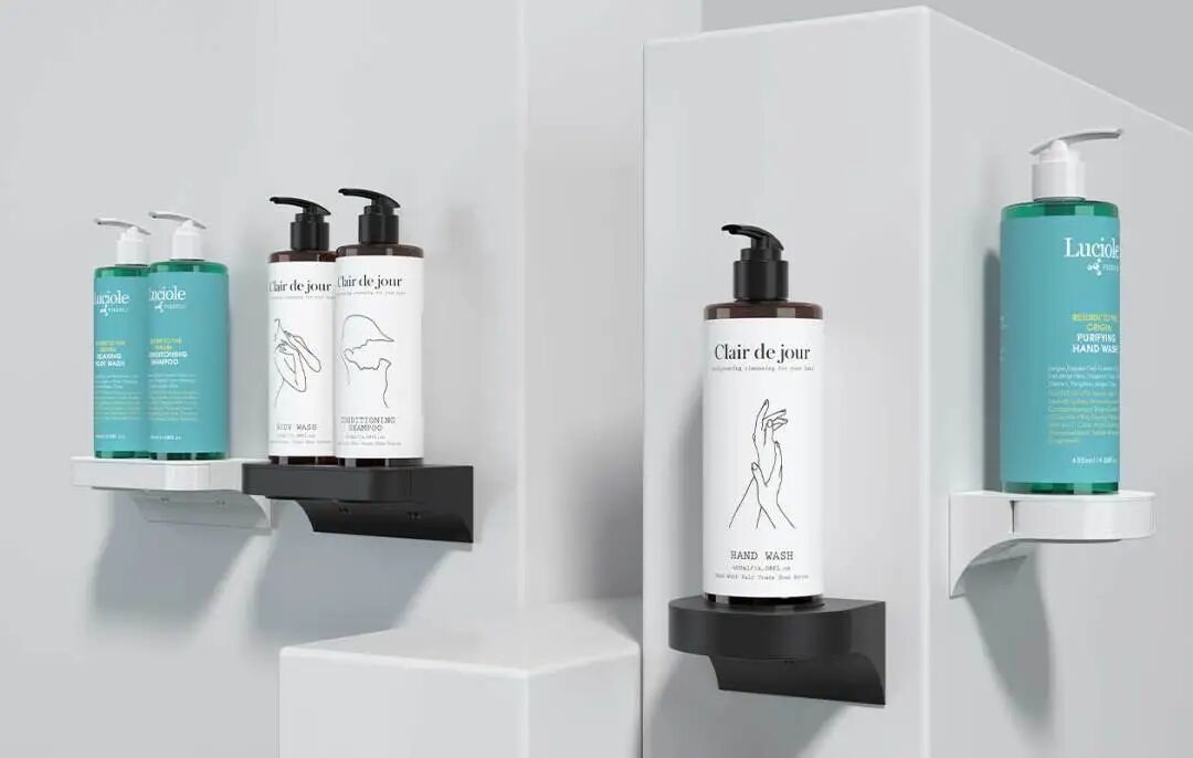 这款磁吸皂液器的设计旨在解决酒店用皂液器存在的丢失和二次污染问题。服务人员只需要通过磁性钥匙触发内部磁吸结构,即可轻松更换瓶子,卡扣式的结构有效减少了丢失和更换过程中的二次污染风险,节约酒店的经济成本。