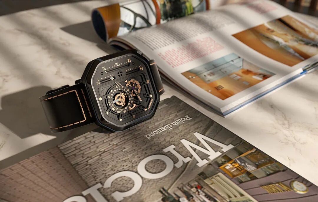 艾戈勒大爆炸系列腕表的设计灵感来自轰鸣的引擎、疾驰的跑车、交错的跑道。黑金色的表盘将跑车的仪表盘与时间刻度融合,形成多层结构的动态机械表盘。腕表在手腕之间呈现层叠的立体空间,时针采用24小时制的双刻度小表盘,分针位于刻度之下,搭配镂空机械设计,能够清晰的看清内部构造,视觉感受更为直观。遮罩关系用于表达时间的流逝,让用户产生紧迫感。每一层表盘的厚度、高度和指针高度都需严格控制,预留足够空间、互不干涉,反复调整实现了多层表盘和指针的穿插设计。错落有致的表盘与指针,都以独特的方式各自走时而又相互配合。