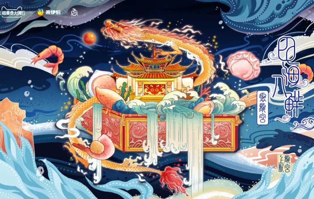 该包装设计首创“龙宫”IP,将“四海八鲜聚龙宫”的神话故事与新潮的表现手法相结合。画面设计上,龙宫设计元素(水底宫殿、盘龙等)经过工笔勾勒渲染,配合高饱和度的传统国风色系搭配,整体画面精致华丽。IP贯穿始终,从礼盒封套到内部产品外包装,都做到了色系统一画风一致。为了避免“一次性消费”,礼盒结构巧妙设计为传统化妆匣,不但延长了使用寿命,也达到了二次传播的目的。