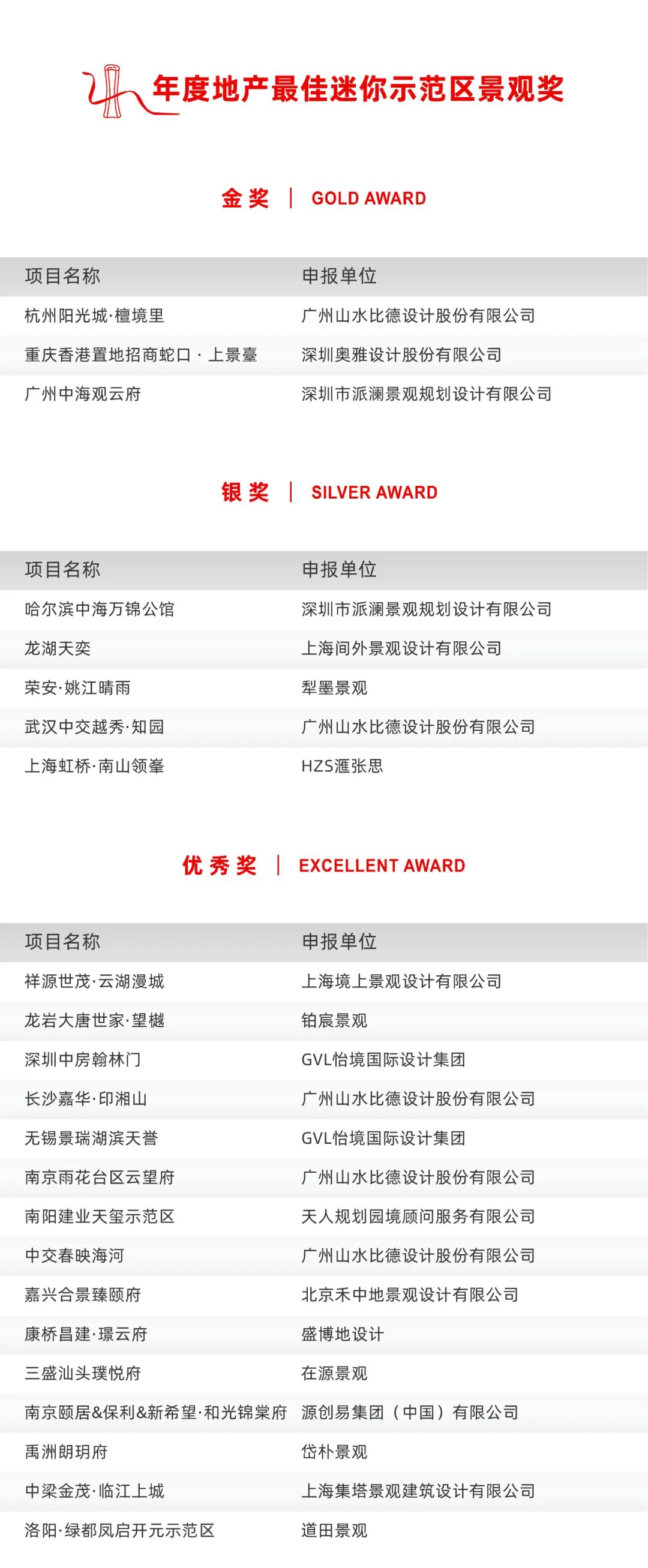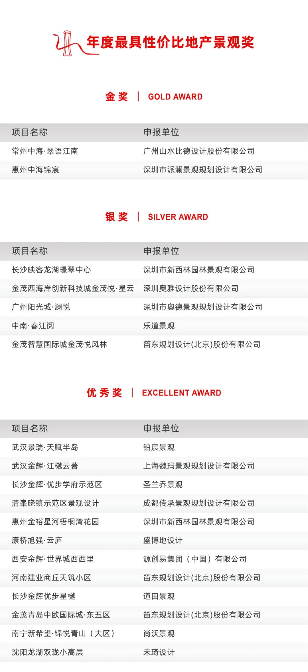 在行业内7位国际顶级大咖、7位知名专家、以及46位知名地产公司甲方专业人士组成的专业终审评审团,经过几个月的认真评选,此番行业内的激烈角逐最终落下帷幕,让我们在此热烈祝贺众位获奖参赛公司!