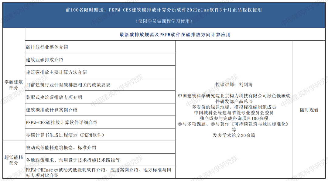 低碳政策+碳排放计算+各专业设计要点(建筑/结构/水暖电/景观)+案例剖析讲解;