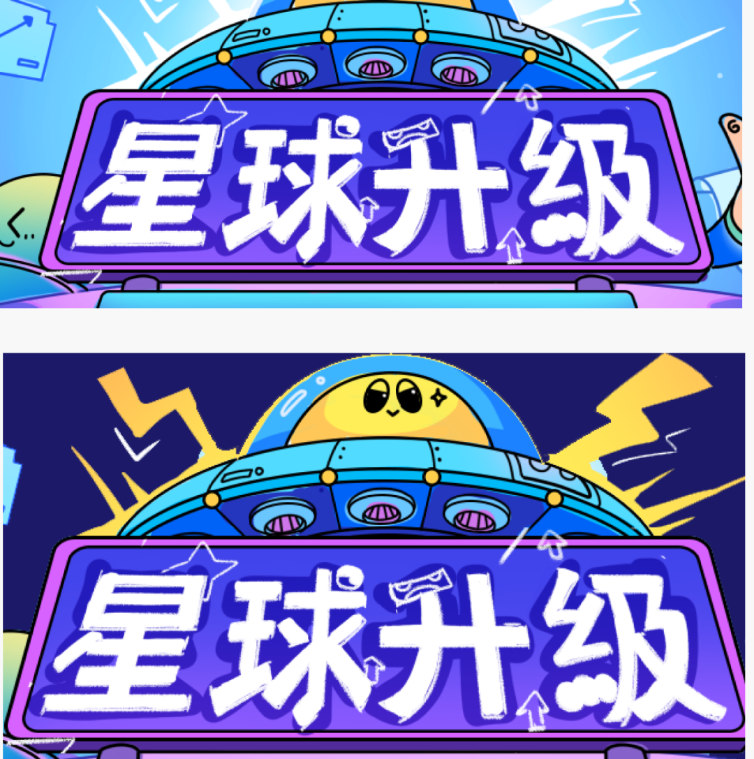 现在的星球升级字体比较聚焦了,但是后面元素太散了,魔方的透视角度不太好看,而且魔方上还有很多元素,太乱了。