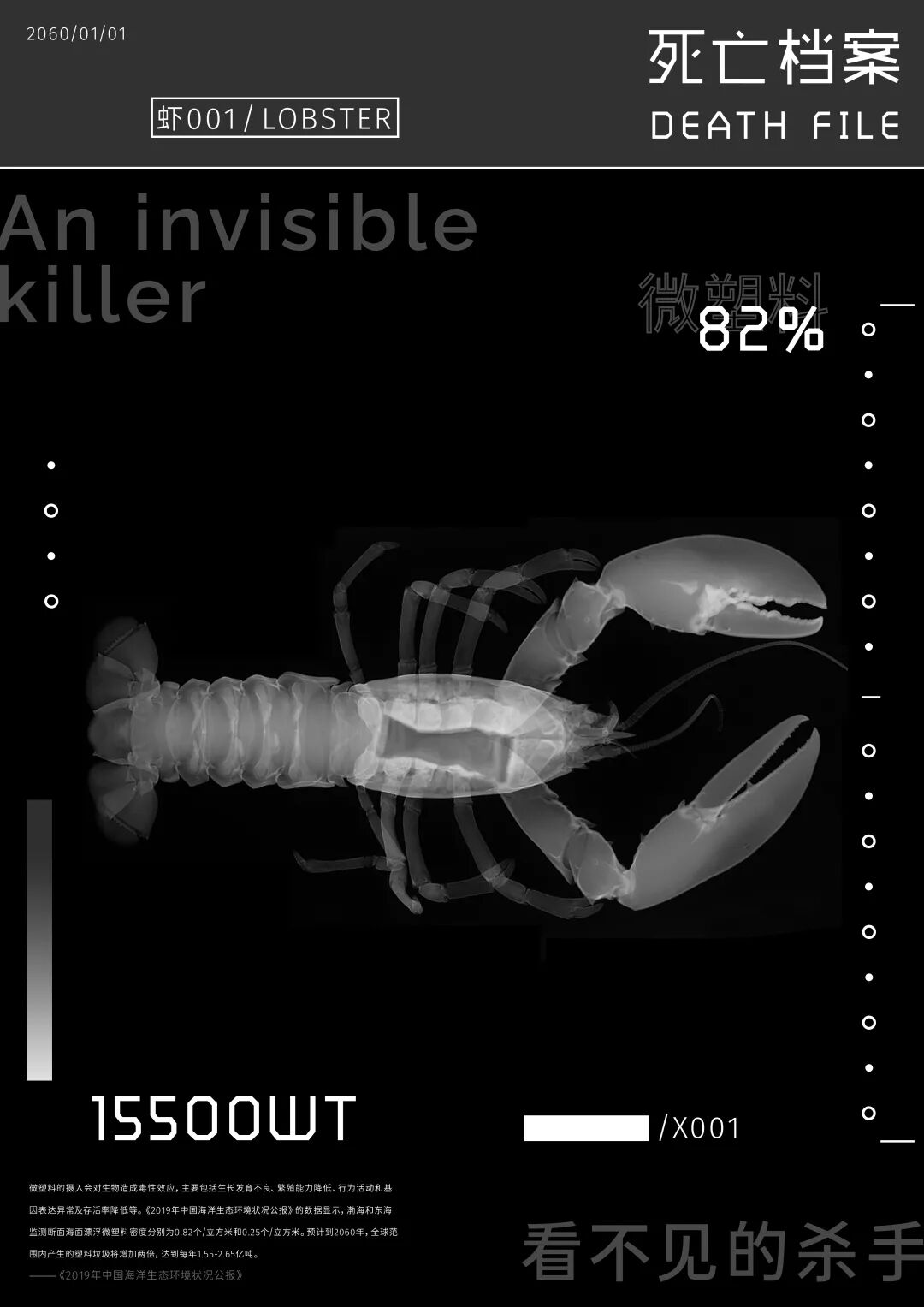 近年来海洋⽣态污染问题愈发严重,海洋垃圾中85%是塑料,所有海洋生物都面临着中毒、行为障碍、饥饿和窒息的严重⻛险。该组广告设计将真实的X光⽚与不同种类的海洋⽣物相结合,通过X光片可以看到海洋⽣物体内充满了由⼈类制造的塑料垃圾,在通过数据对于海洋污染现状进行科普的同时,引起⼈们对于海洋塑料污染问题的重视,呼吁⼈们共同保护海洋⽣态环境,共建美丽家园。