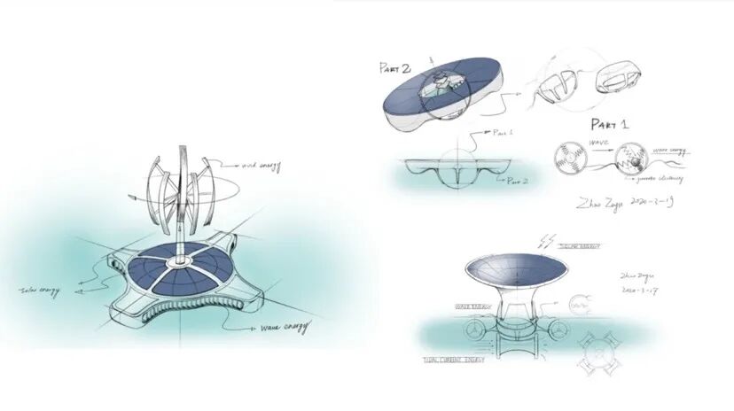 通过对风能、波浪能、潮汐能采集的技术调研以及对国内外耦合发电平台的研究,该团队形成了由Darrieus模型、单晶硅太阳能板、球体波浪能采集装置及Savonius模型组成的小型海洋多能源采集站概念设计,探索海上多能源采集方式。