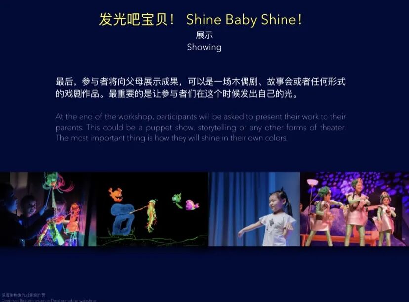 “发光吧宝贝”深海生物发光戏剧创作营让5至9岁的孩⼦们通过道具 / 服装制作、 热身游戏、剧本构建认识深海发光⽣物、了解发光作⽤和培养海洋⽣态保护的意识。让孩⼦们在玩乐过程中将⾃⼰与⼀起⽣活在这颗蓝⾊星球上的⽣物通过想象连接,⼀起在“深海⾥发光遨游”,让他们理解这群特别的⽣物、获得与团队⼀起创作作品的充实感以及海洋保护的意识。