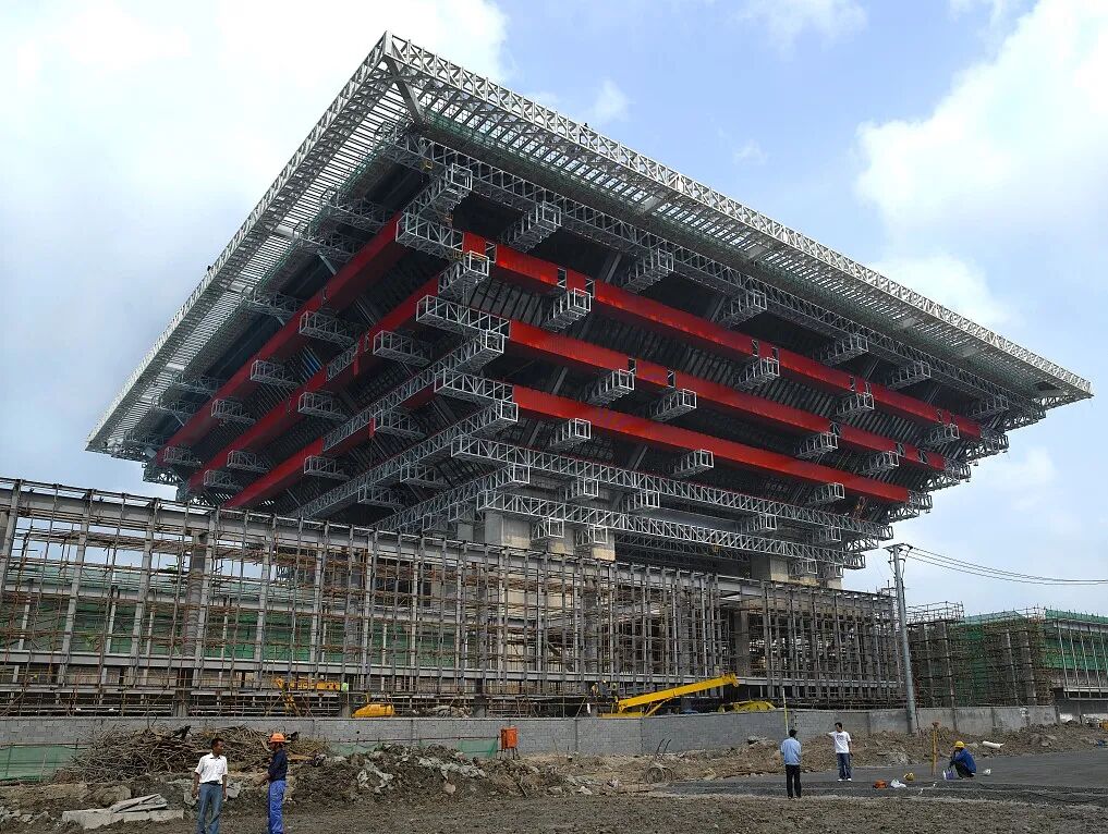 2010年上海世博会中国馆“东方之冠”从外形上看是对斗拱的模仿,用现代的钢筋混凝土结构放大一个传统木构建筑中的结构构件,是想通过斗拱造型来代表中国建筑独特的地域性。