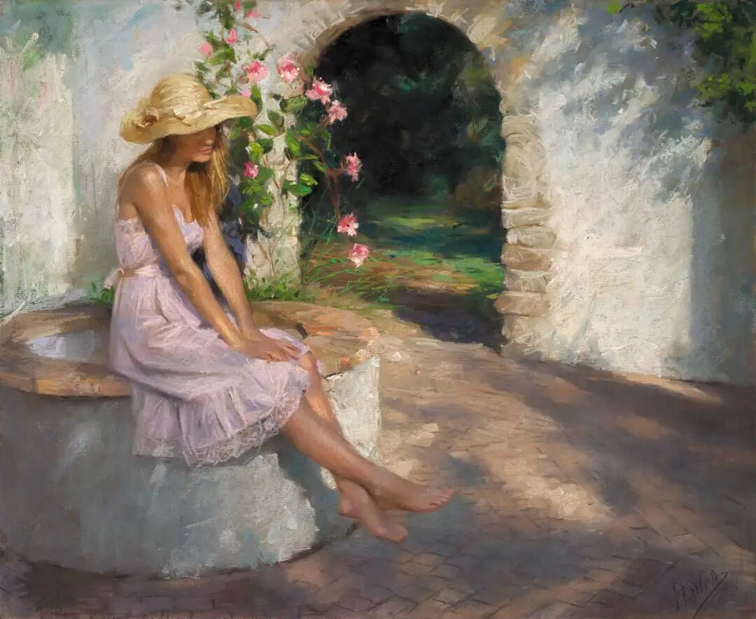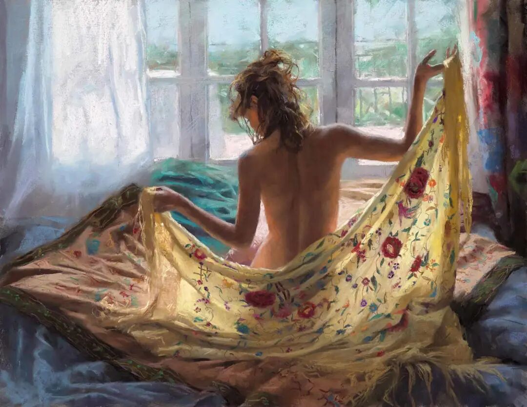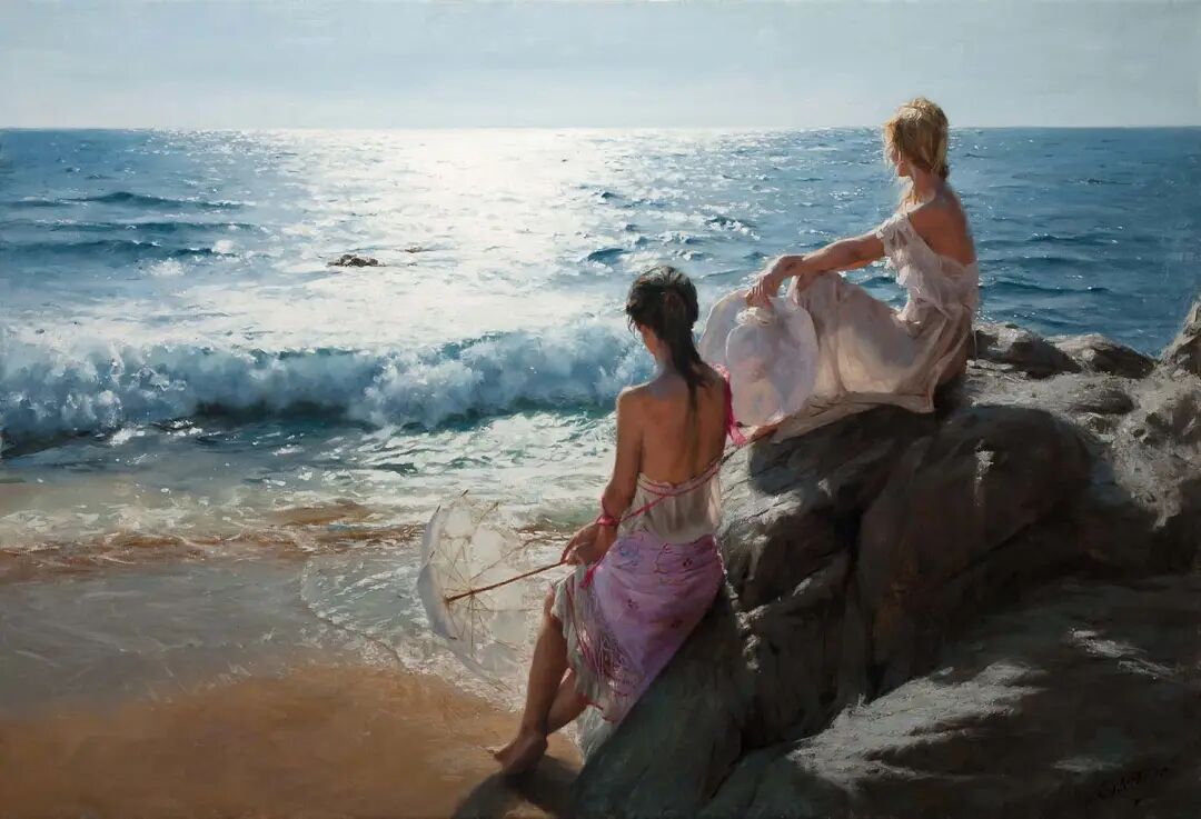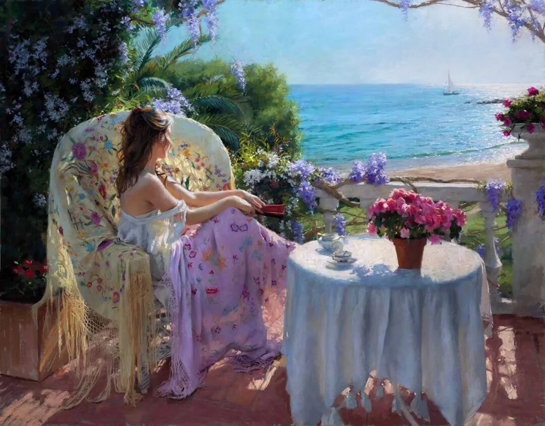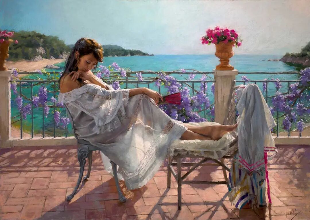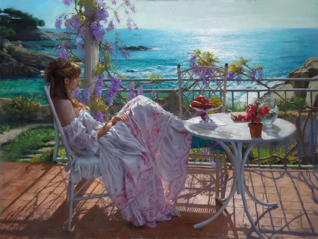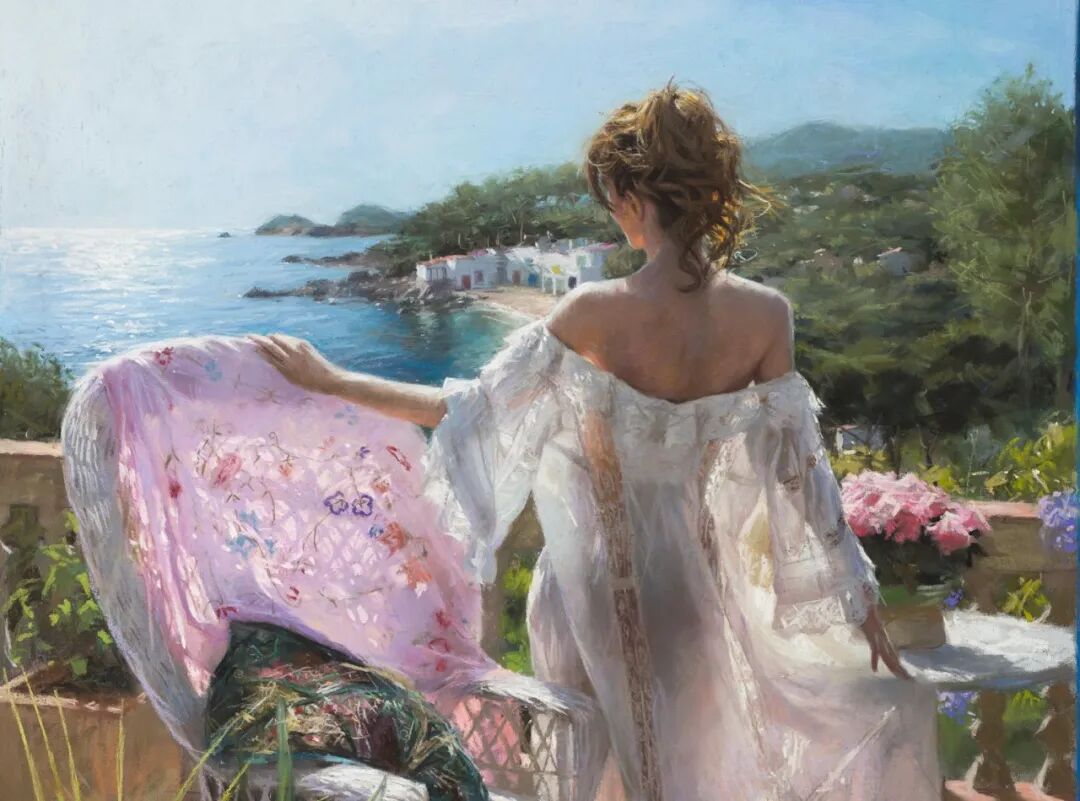 Vicente Romero Redondo唤起了阳光下的半透明织物、明亮水面上的波纹,朦胧的热浪以及布拉瓦海岸艺术故乡的色彩浸透的阴影,将花园、大海或卧室等自然私密环境中的美丽女性转化为迷人而独特的画布艺术作品。柔和和谐的色彩,微妙的光影舞动,油画与粉彩的巧妙对话,赋予他的画作浪漫甚至诗意的氛围。