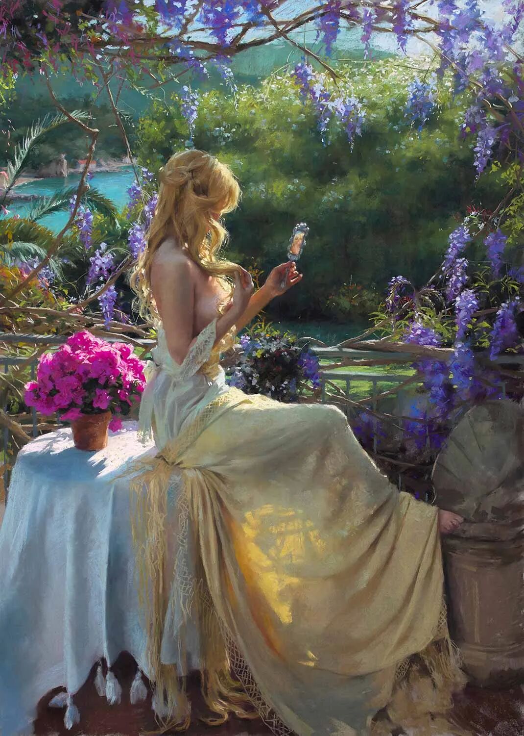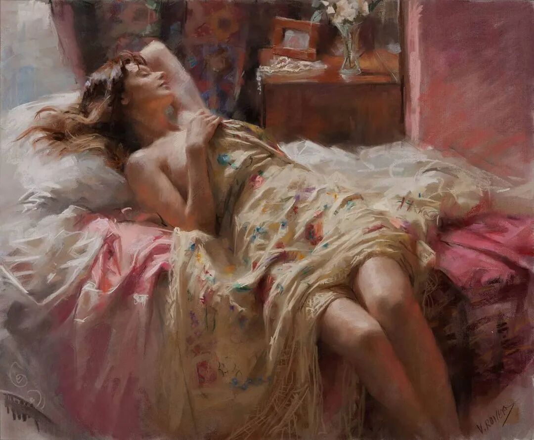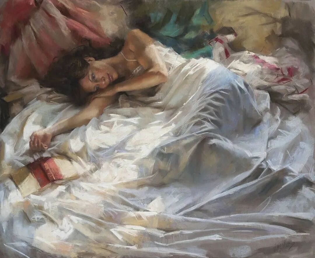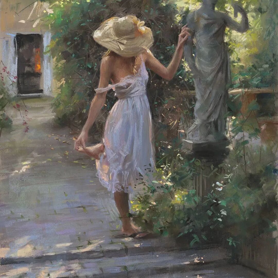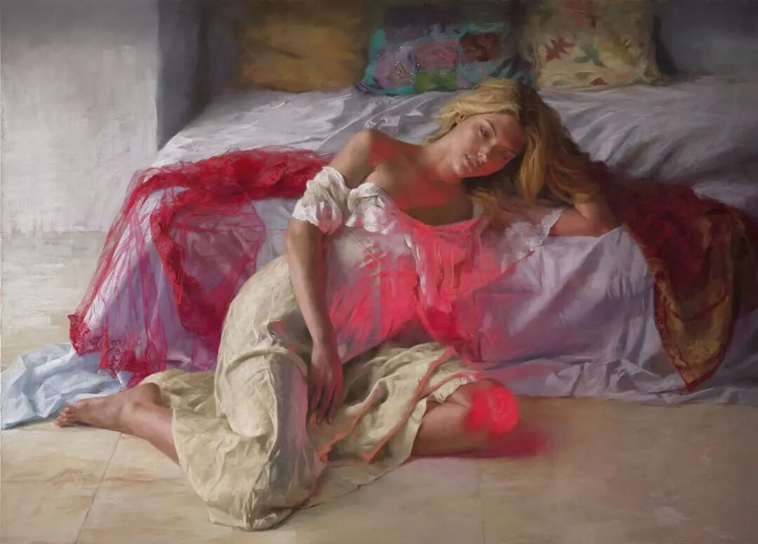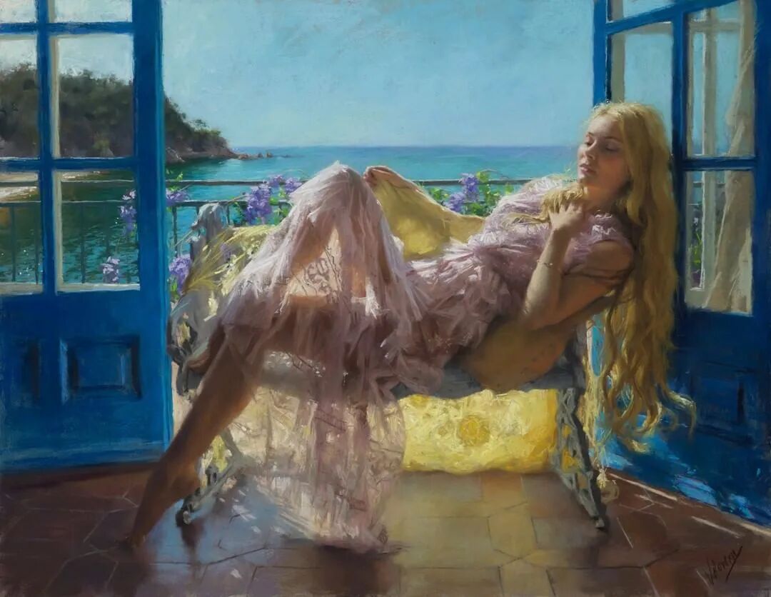 Vicente Romero Redondo唤起了阳光下的半透明织物、明亮水面上的波纹,朦胧的热浪以及布拉瓦海岸艺术故乡的色彩浸透的阴影,将花园、大海或卧室等自然私密环境中的美丽女性转化为迷人而独特的画布艺术作品。柔和和谐的色彩,微妙的光影舞动,油画与粉彩的巧妙对话,赋予他的画作浪漫甚至诗意的氛围。