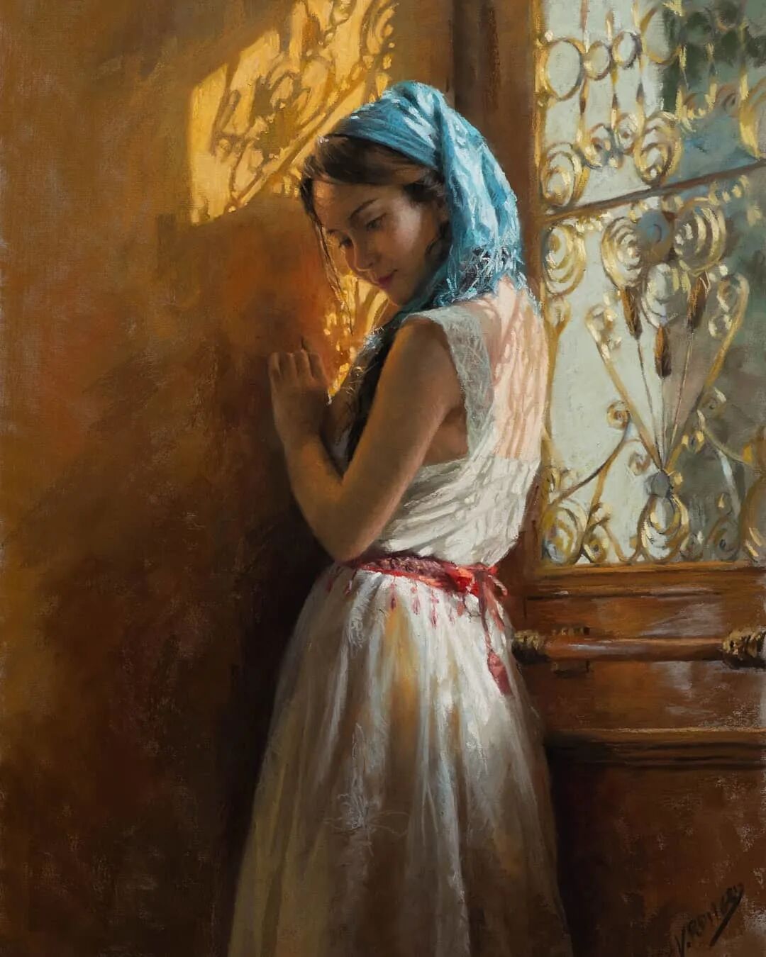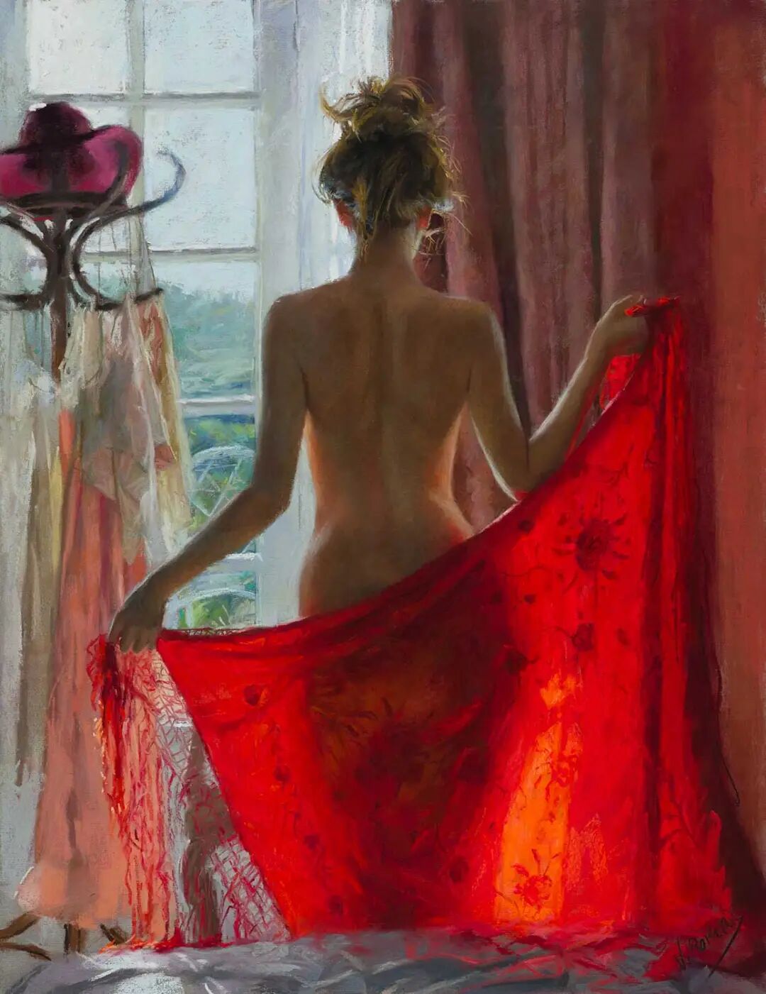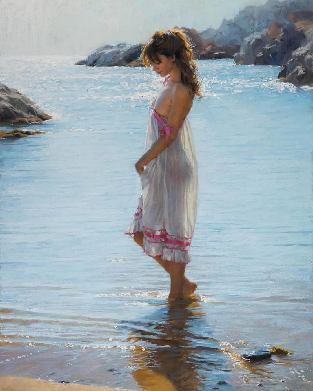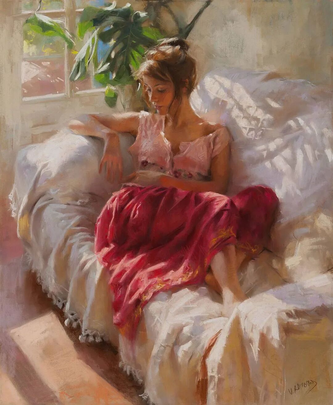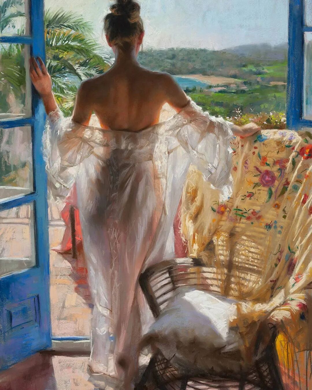 Vicente Romero Redondo唤起了阳光下的半透明织物、明亮水面上的波纹,朦胧的热浪以及布拉瓦海岸艺术故乡的色彩浸透的阴影,将花园、大海或卧室等自然私密环境中的美丽女性转化为迷人而独特的画布艺术作品。柔和和谐的色彩,微妙的光影舞动,油画与粉彩的巧妙对话,赋予他的画作浪漫甚至诗意的氛围。