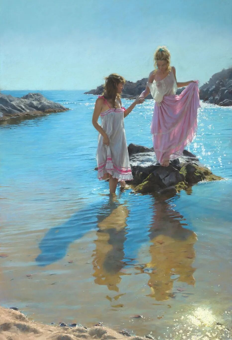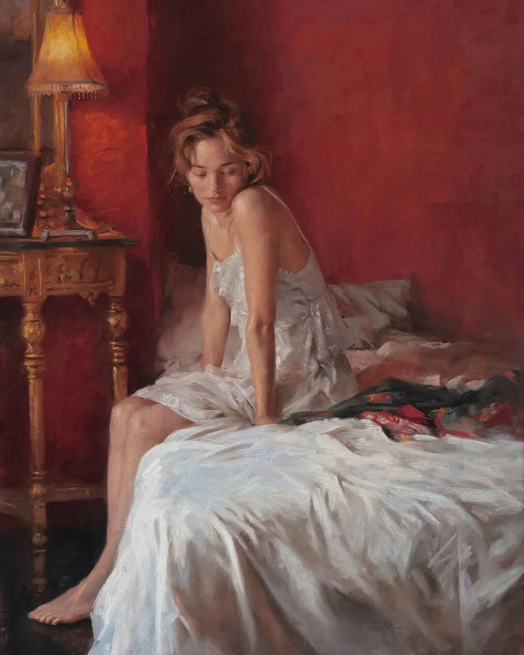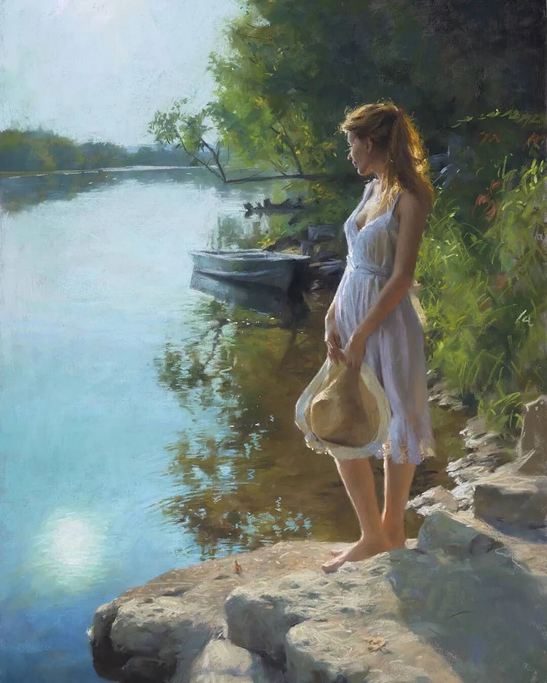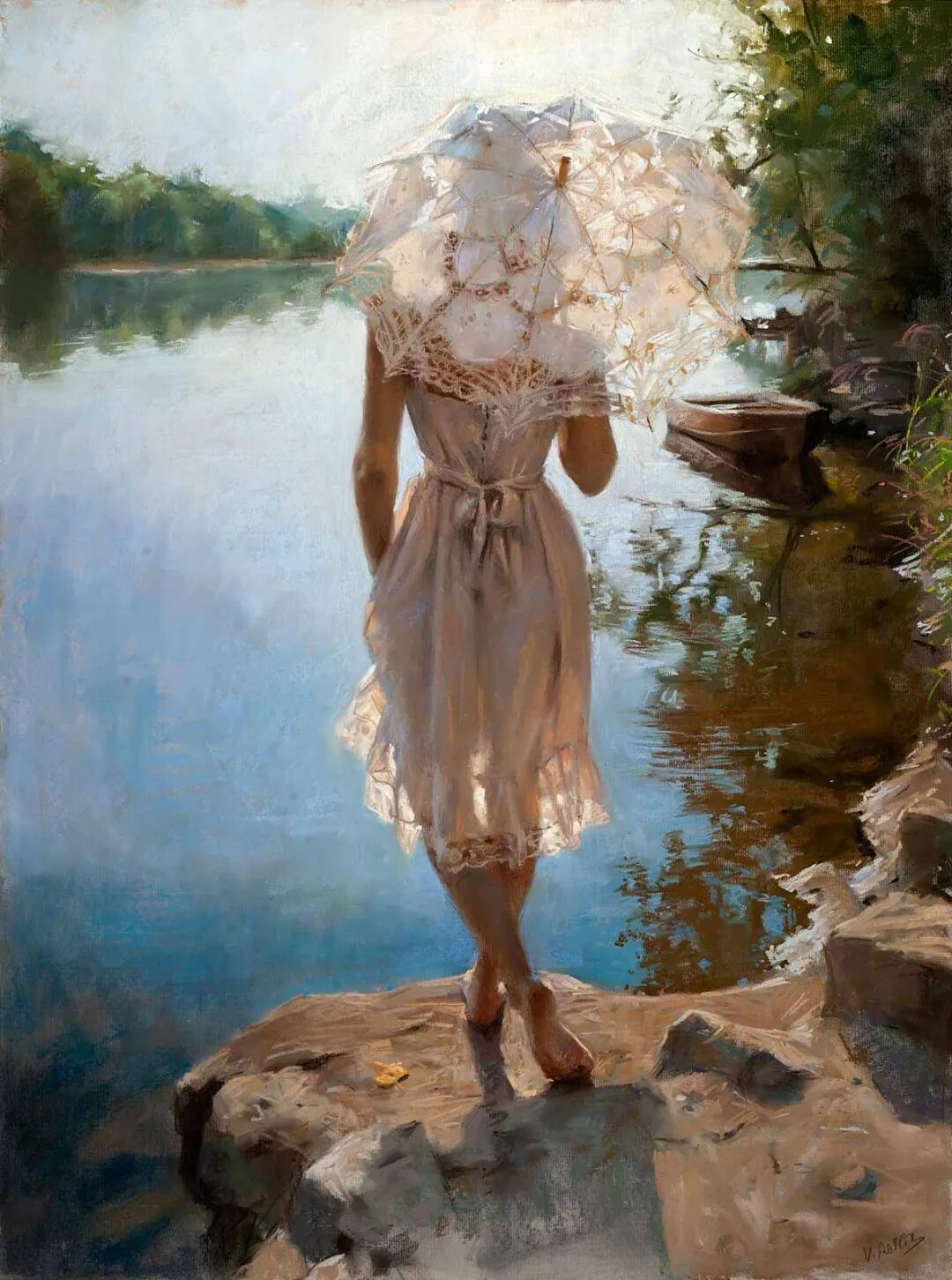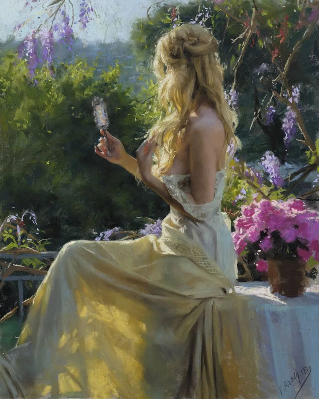 Vicente Romero Redondo唤起了阳光下的半透明织物、明亮水面上的波纹,朦胧的热浪以及布拉瓦海岸艺术故乡的色彩浸透的阴影,将花园、大海或卧室等自然私密环境中的美丽女性转化为迷人而独特的画布艺术作品。柔和和谐的色彩,微妙的光影舞动,油画与粉彩的巧妙对话,赋予他的画作浪漫甚至诗意的氛围。