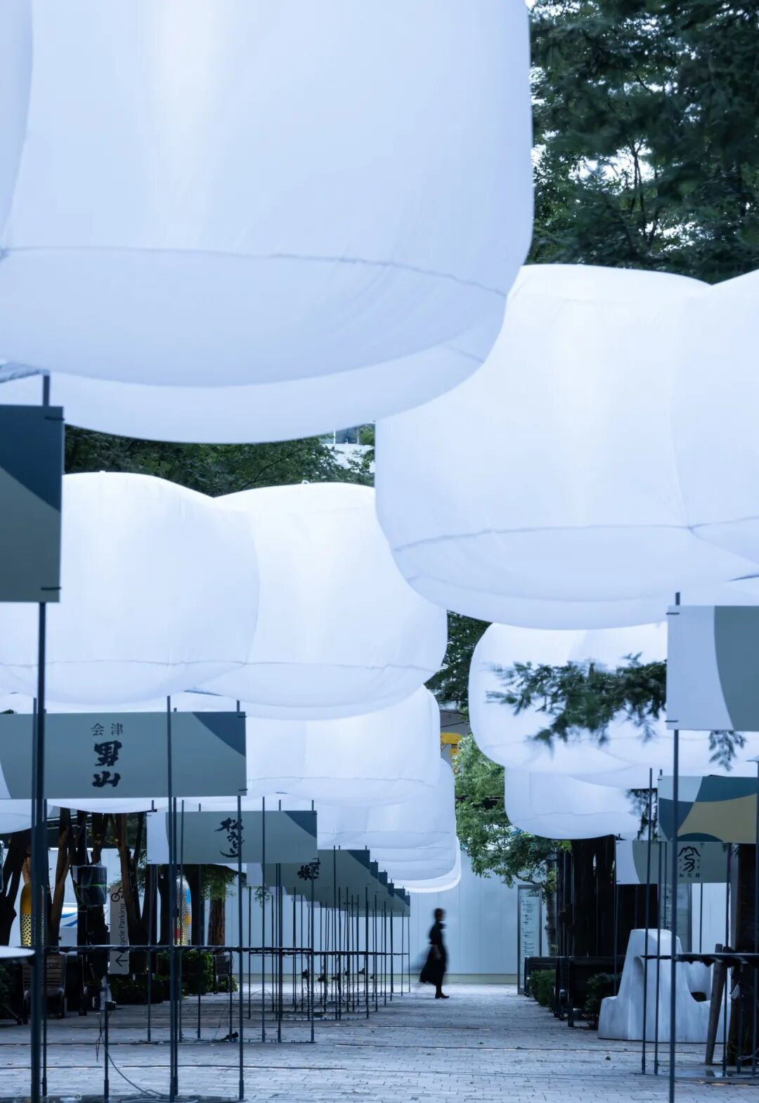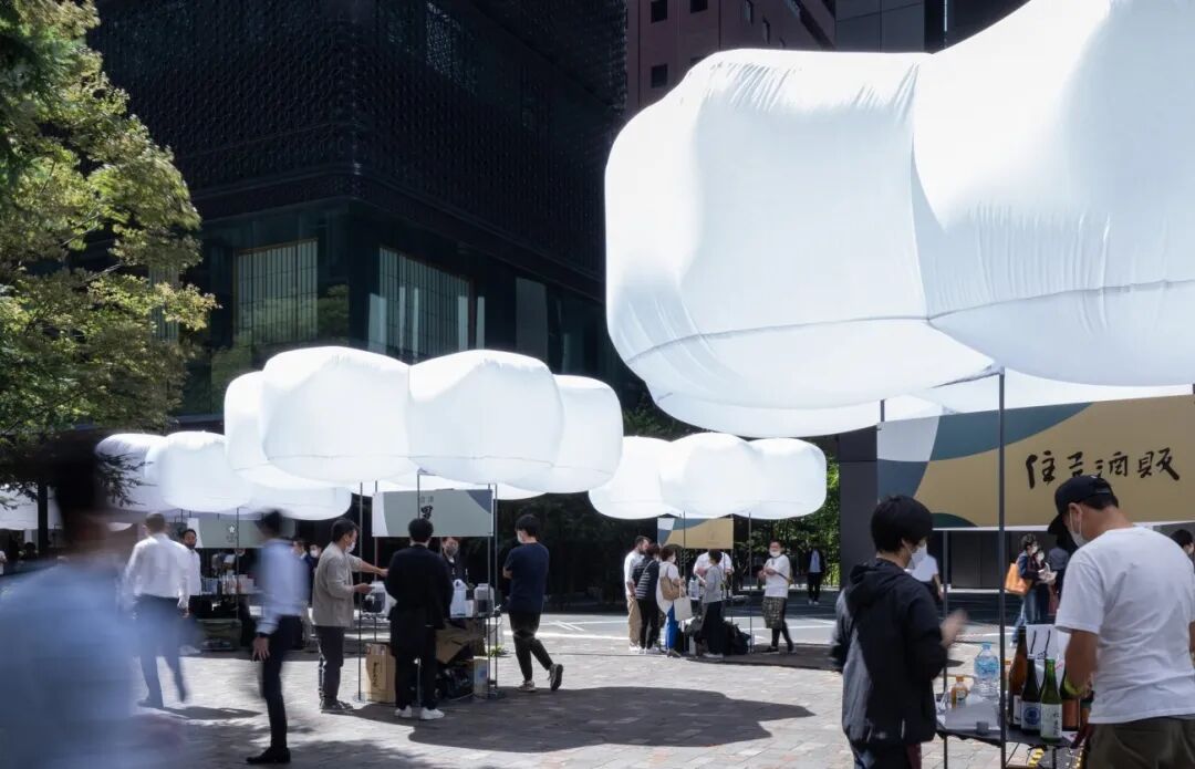 在 "OKDO OKOME BALLOON "下,参观者可以一边品尝清酒,一边与来自全国各地的清酒酿造厂和库存商交谈。气球在白天柔化强烈的阳光,并为其遮挡雨水,在夜间柔和地发出光线,像灯笼一样照亮这个地区。