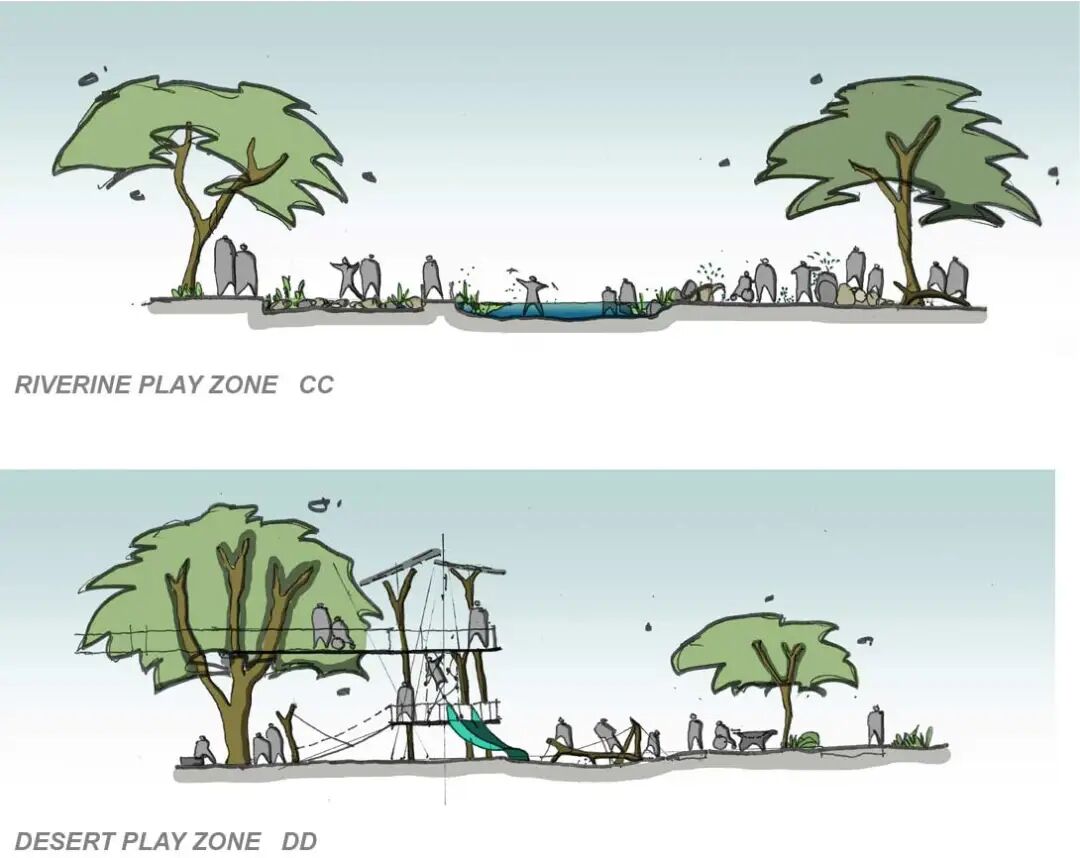 The creek represents aquatic systems focusing on water play, and the sand pit demonstrates the hot desert environments. The bamboo maze, trampolines, and grass chimes recreate the Savannah.