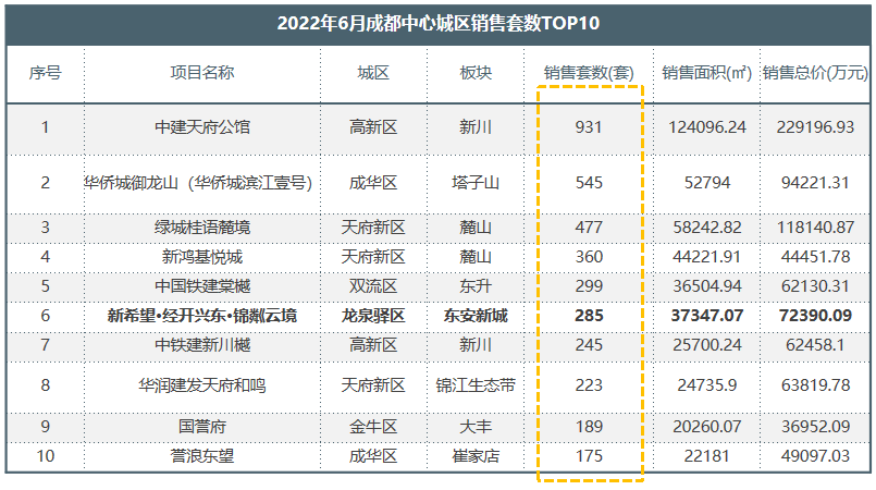 它打破了板块内曾一盘独大的竞争格局。今年5月,项目第一次取证首开产值达10个亿,6月又以285套的认购套数,跻身中心城区TOP6,而排名在它前面的要么是低价网红盘,要么是高比例的人才房项目。