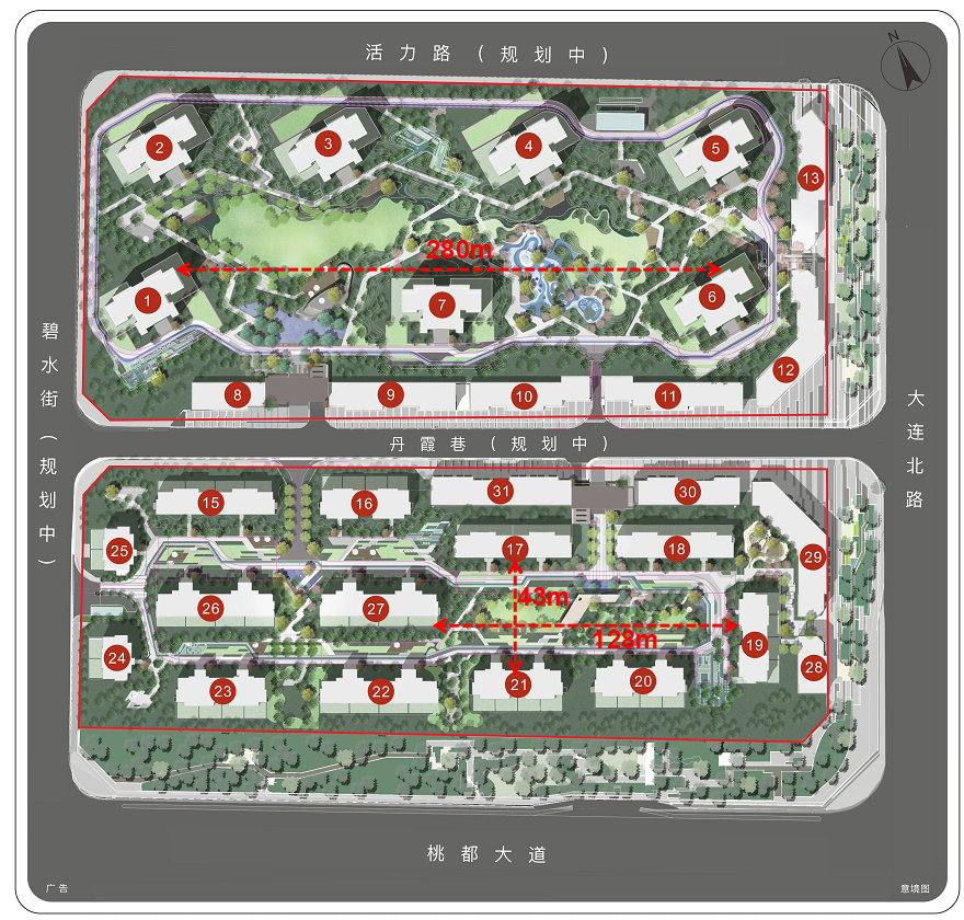 高层的中庭尺度更甚,东西楼间距最大280m,能享受到两大中庭景观,是目前区域内难得头排观湖的品质小区。