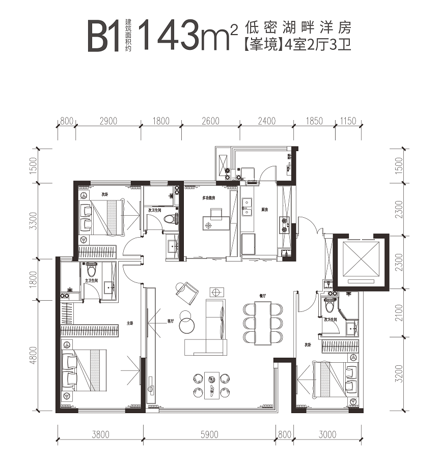 3. 首改首置大平层化的产品最优解:项目143㎡洋房户型整体十分方正,真正做到了动静分区,功能性强且无浪费面积,不仅拥有12.7m的超大面宽,形成巨幕LED 极佳视野观景面,客厅总共面积约40㎡,设计结合了横厅和竖厅的优势,开间达到5.9m,也是目前改善型项目中最新的设计理念,有效抓住了客群喜好,将首改首置产品实现了大平层化。