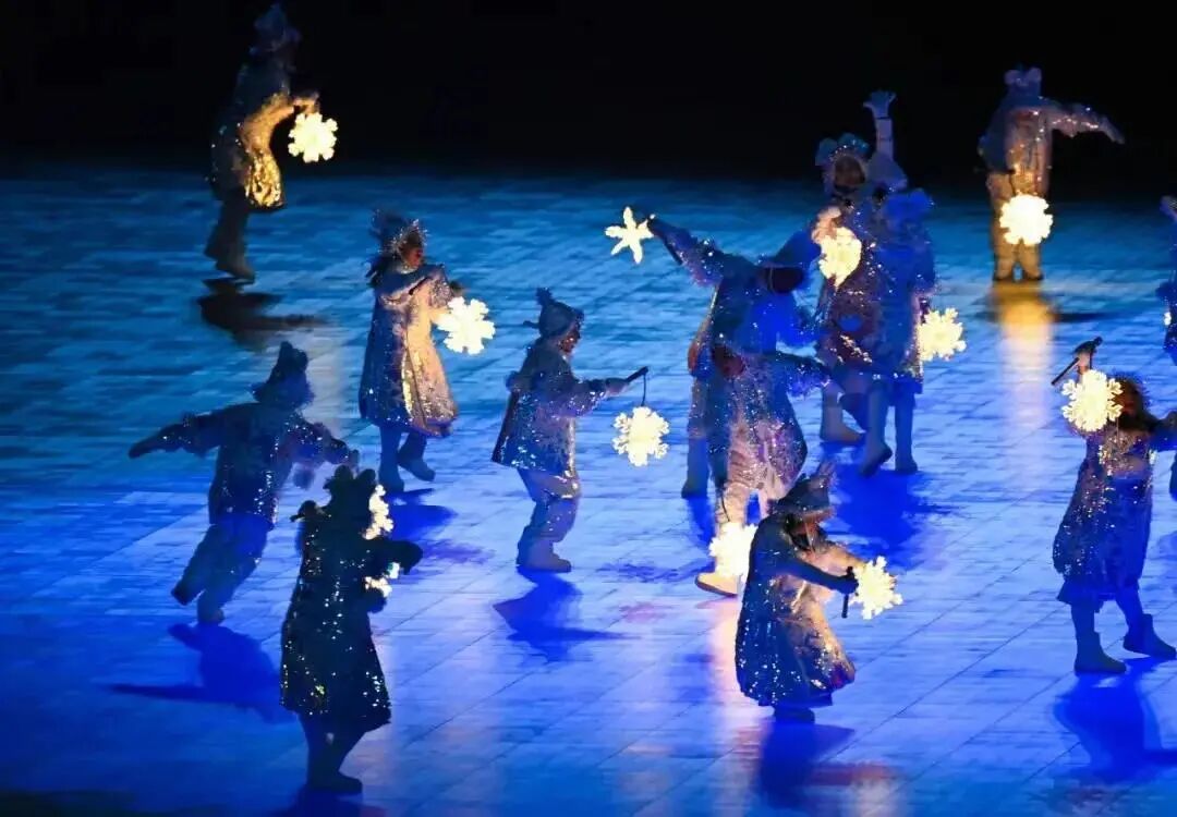 开场,由提着雪花花灯的小朋友,展现正月十五元宵节前后“闹花灯”的传统,点亮场地上的“冬”字会徽,在斑斓绚丽的色彩中,北京2022年冬奥会闭幕式开启拥抱世界的欢聚。