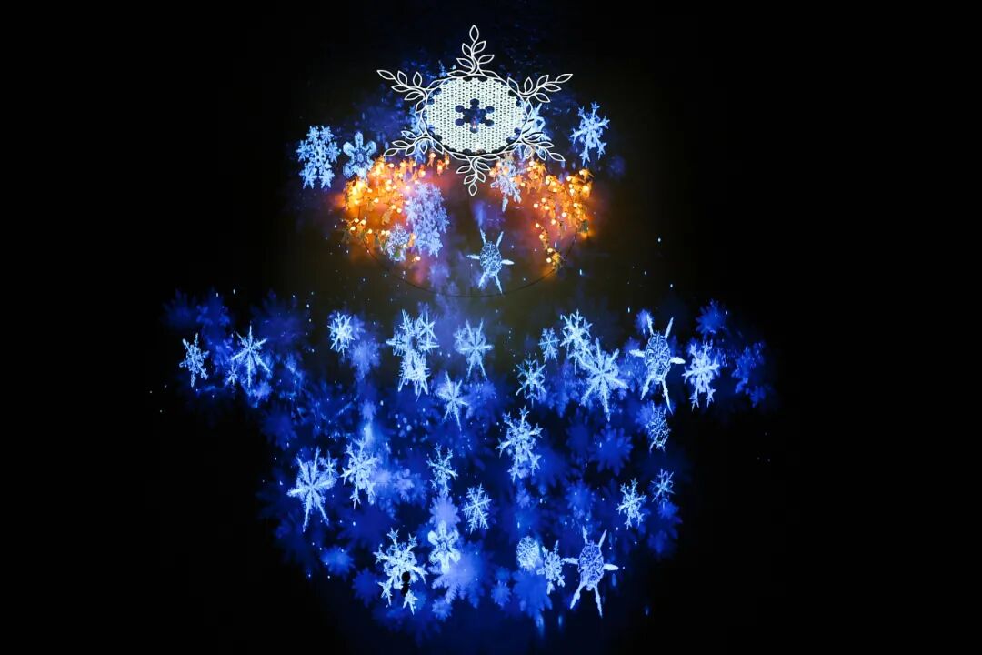 在美学基调方面,主创团队大胆使用中国红碰撞冰雪蓝,将灯笼、中国结等中国传统文化符号,作为表演元素融入仪式当中。