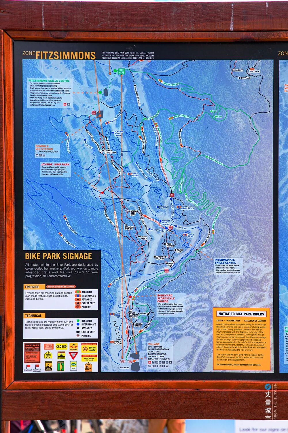 1999年,惠斯勒山地自行车公园开始营业,并逐步由最初的菲茨西蒙斯区,扩展到4个区,开发了超过70条标记路线,跨越80公里和4,900垂直英尺。