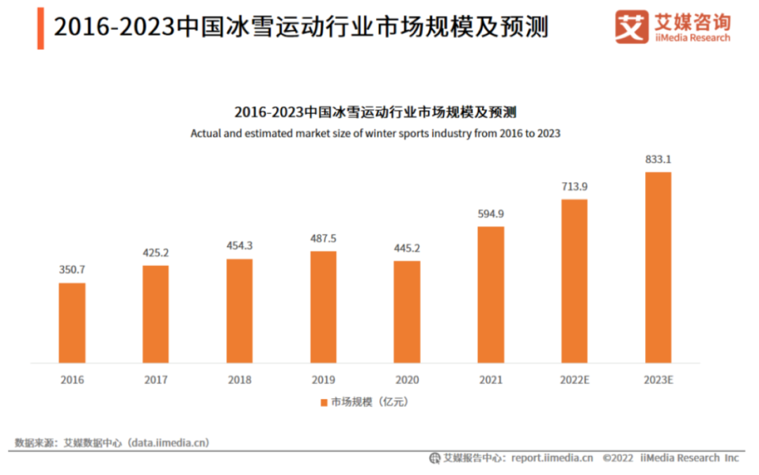 2月4日,2022北京冬奥会如期而至,推动冰雪运动和相关产业加速走进大众视野。艾媒咨询日前发布的《2022年中国冰雪运动行业发展趋势报告》显示,2021年中国冰雪运动行业市场规模为594.9亿元,预计2022年将达713.9亿元。