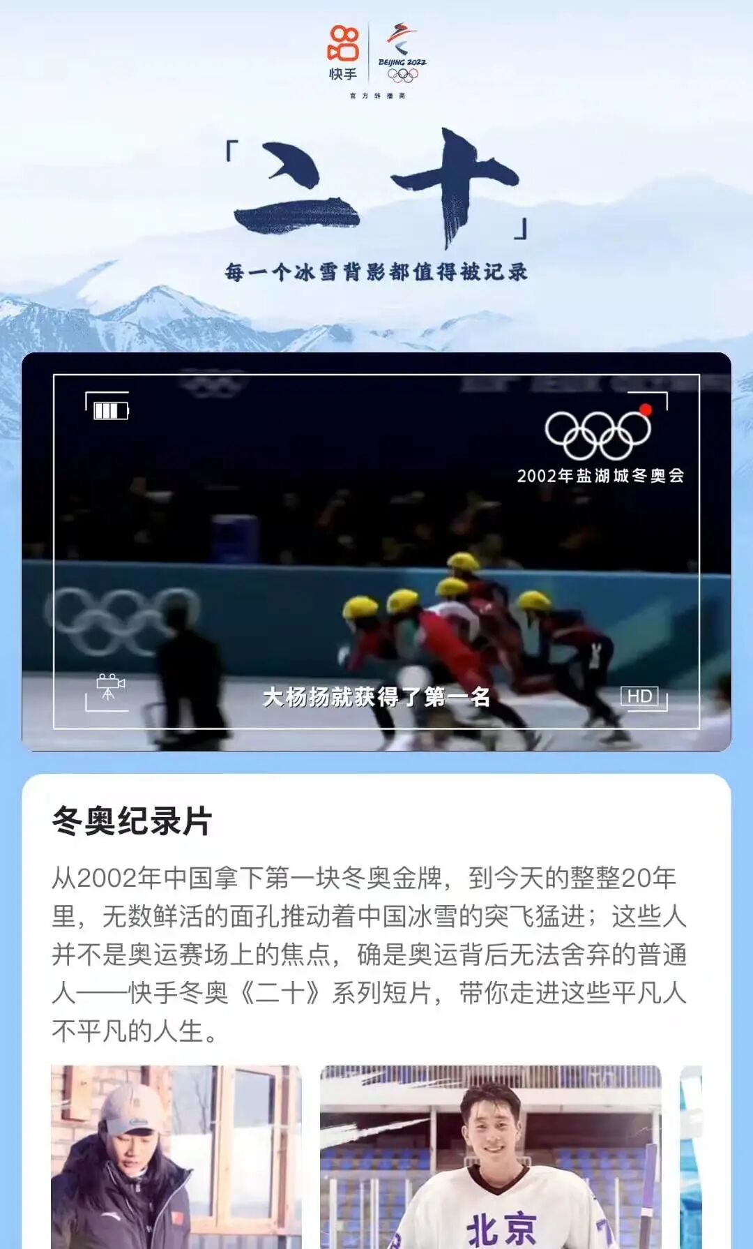 直到今年1月底,快手拍摄了冬奥系列短片《二十》,两人的故事被选中,才被更多人所熟知。短片中,两人不约而同地表示,希望自己培养的孩子能够有朝一日站在奥运赛场。截至目前,两条短片的点赞量分别超过20万次,评论多达数千条。