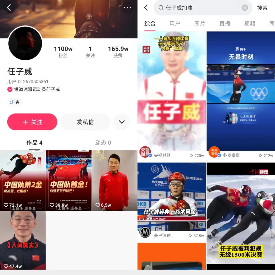 在快手上,任子威的粉丝已超1100万,且仍在快速增长中。话题“任子威加油”登上站内热搜和奥运热榜首位,相关视频播放量当晚就突破1.5亿次。