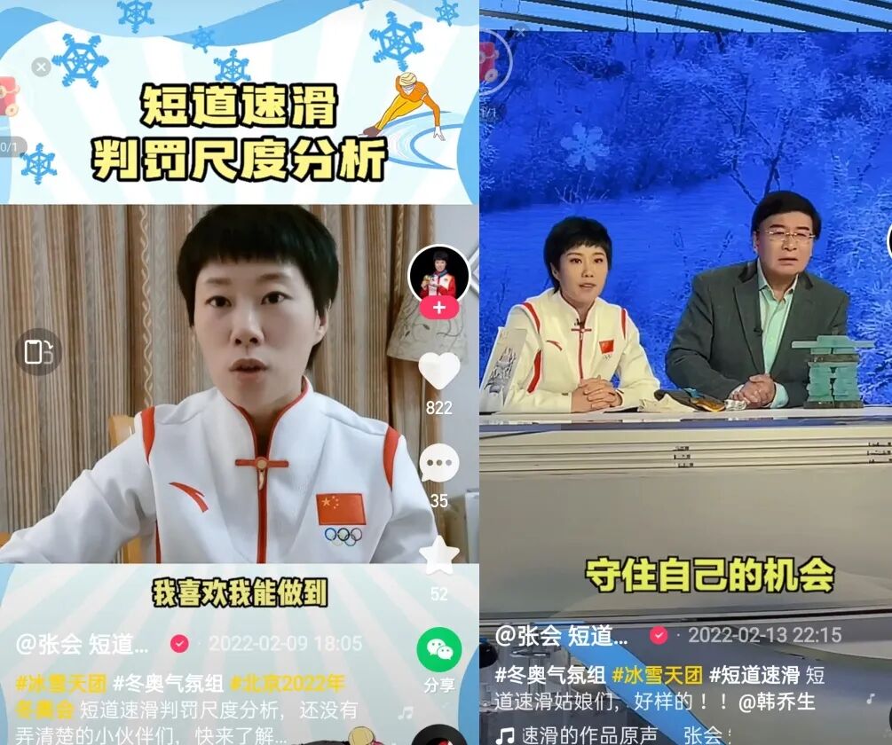 除了关注任子威的比赛后,张会还在中国队的多场重要比赛结束后,第一时间直播连线进行点评。她还拍摄了一系列短视频,内容包括赛事复盘、规则解读、冰雪运动冷知识等,单条点赞量从数千至数万不等。