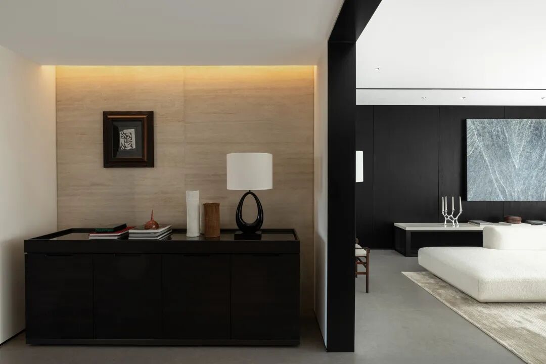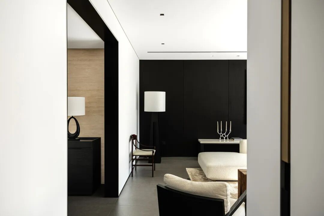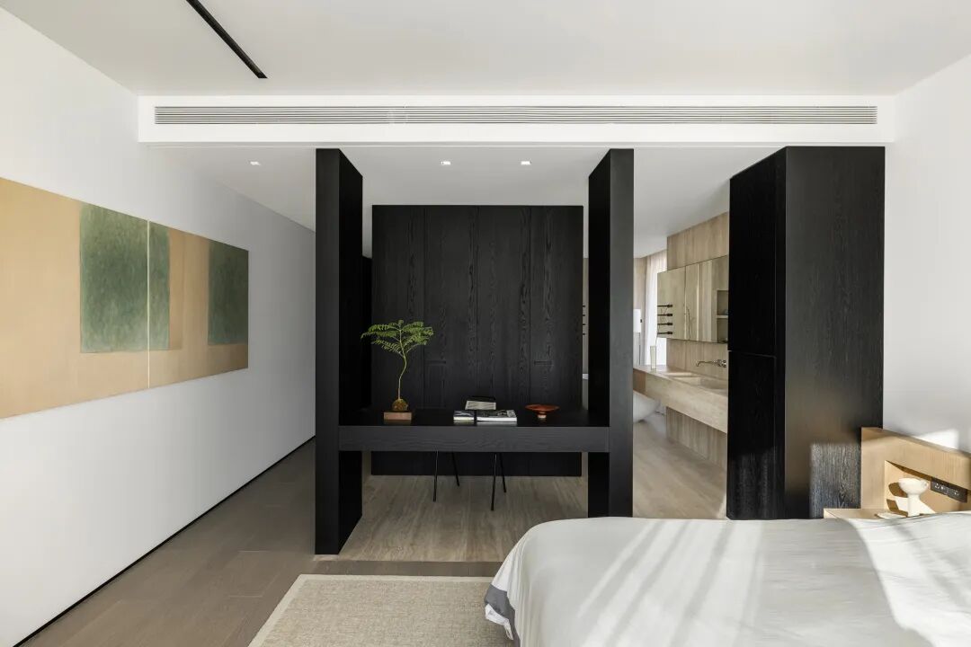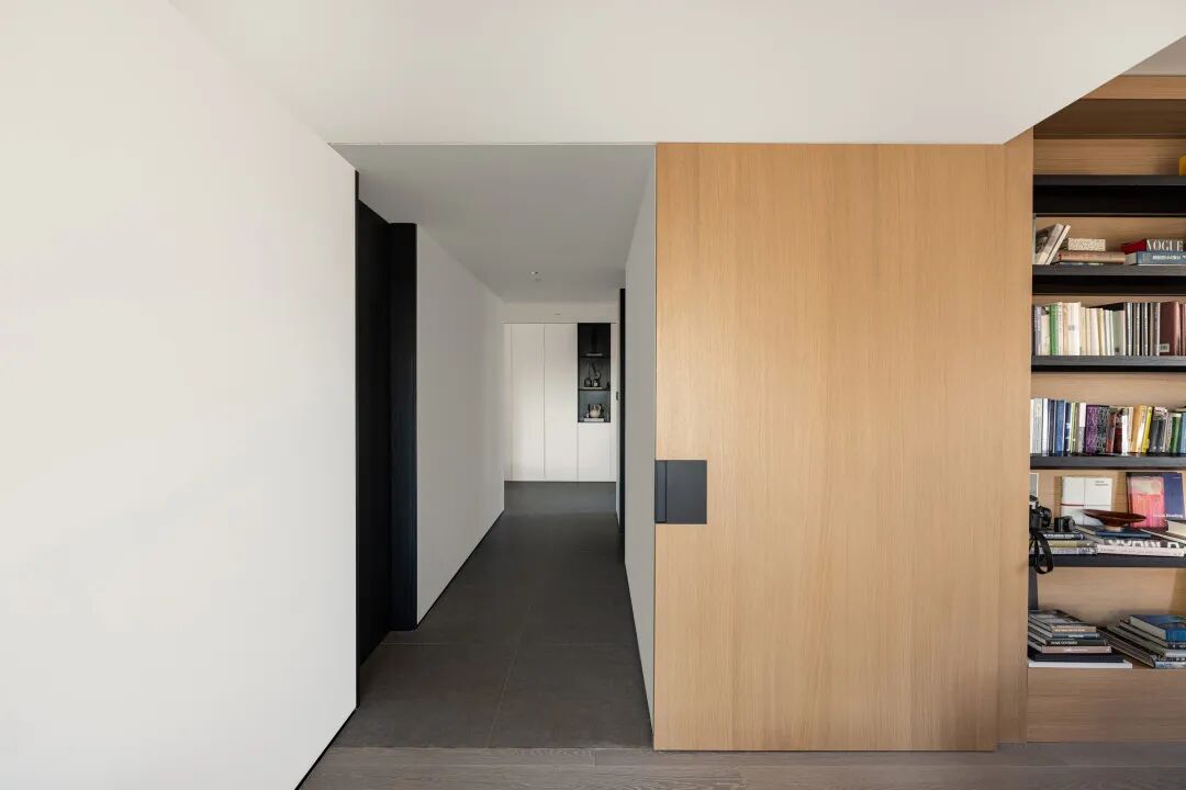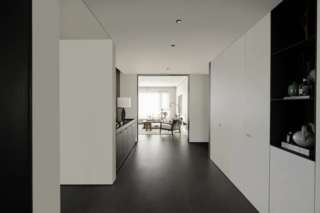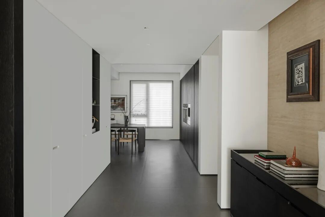 构建功能,也是在构建生活的秩序,通过一条走廊,将公共区域与私密空间巧妙连接,形成了动静分离的结构。宽敞的公共空间,给予宅家无限自由,去除了杂色,只保留宁静深沉的底色,映射出当下在日常中收获满足的纯粹状态。