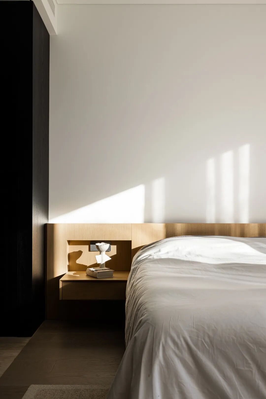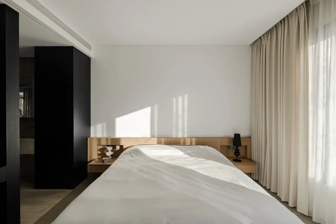 自然至简的氛围从公共区域延伸到私密的卧室,素色空间基地与干净的床品带来十足的舒适感,情绪再一次被深刻感知。此时,是身心完全交付给家的时刻,人与空间达成一种默契,吾心安处,给予全部安全感、信任感,开启一场舒适的好眠。