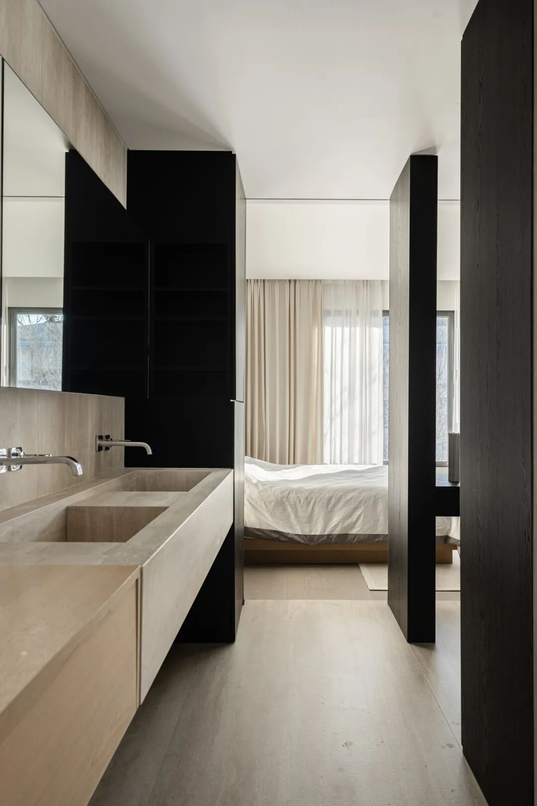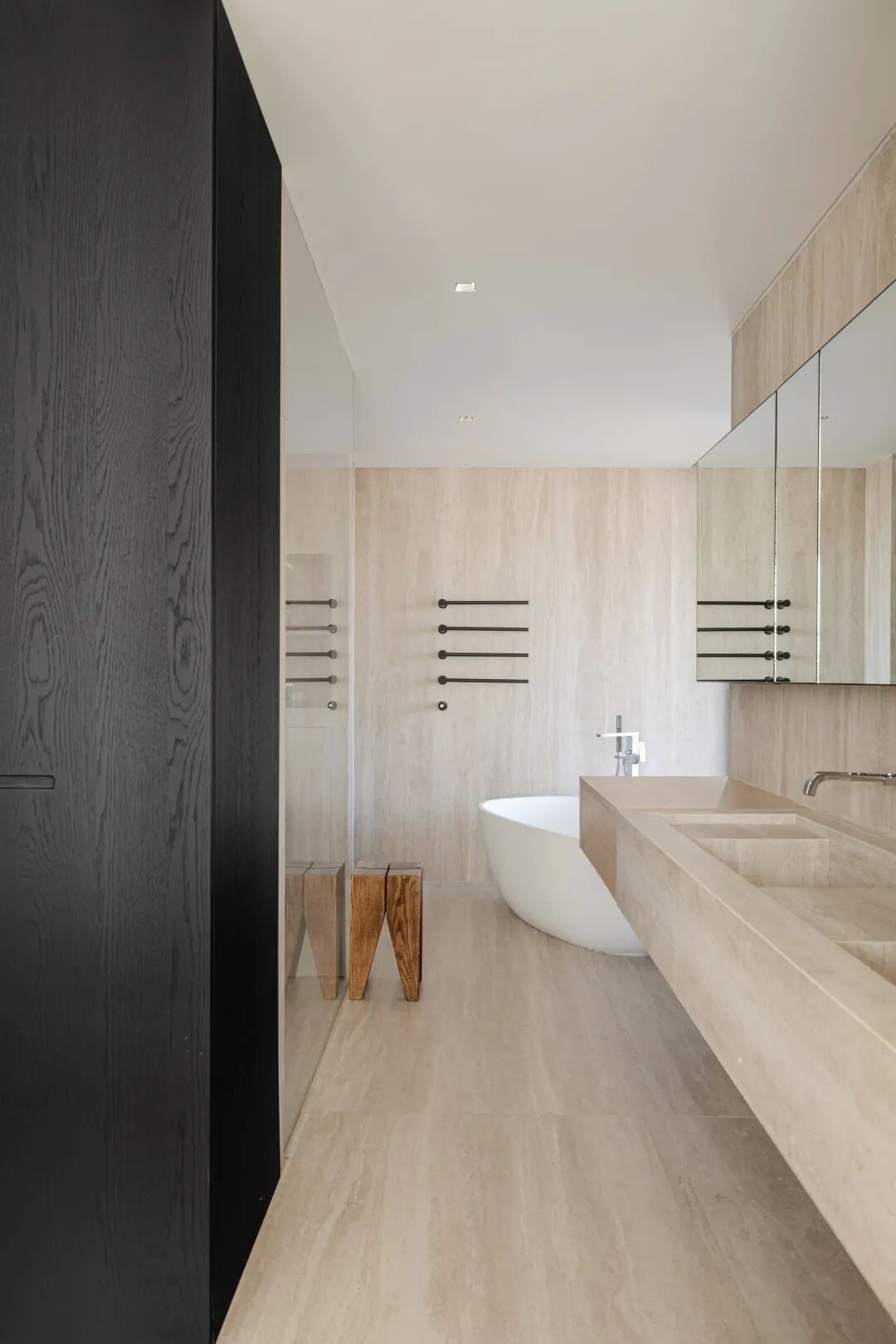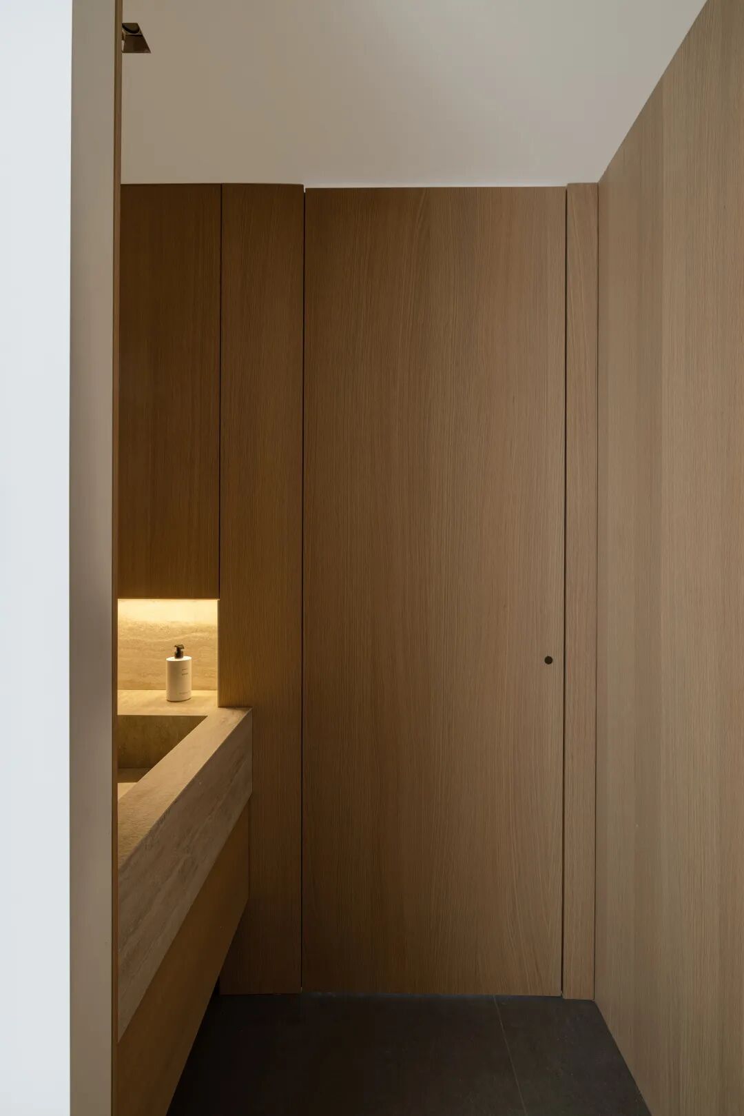 与此同时,设计师运用自然材质来传递细腻的情绪感受。木头是我们生活中最亲切的元素,带来舒适与活力,也表达平淡与真实;白橡的柔和,黑橡的优雅,如河流与山川,白昼与黑夜,洞石的孤寂与质朴,为现代空间增添了时间划过的痕迹。