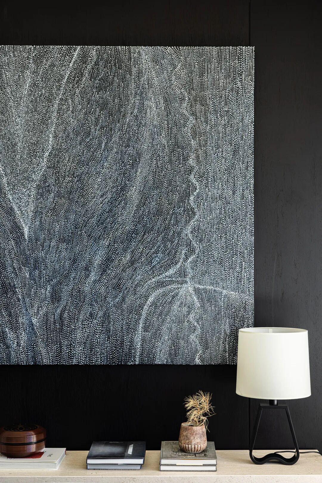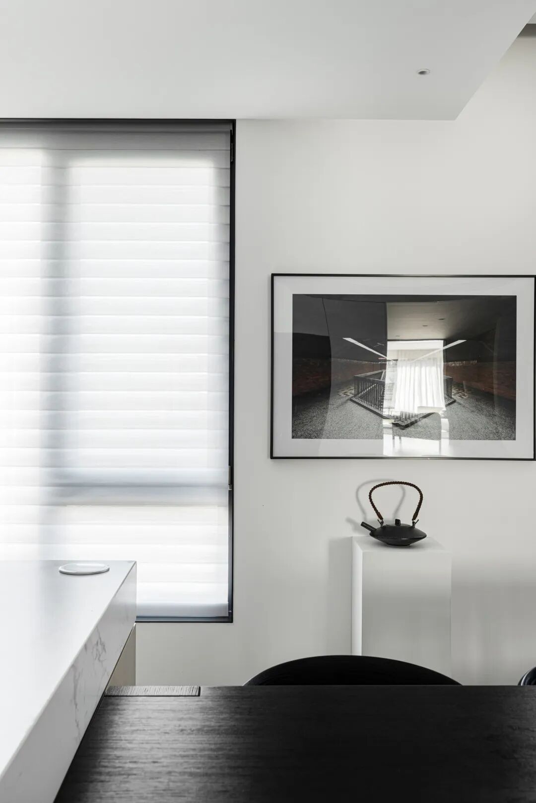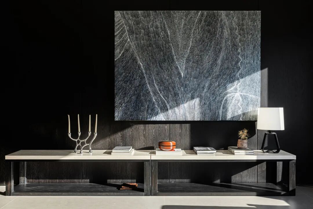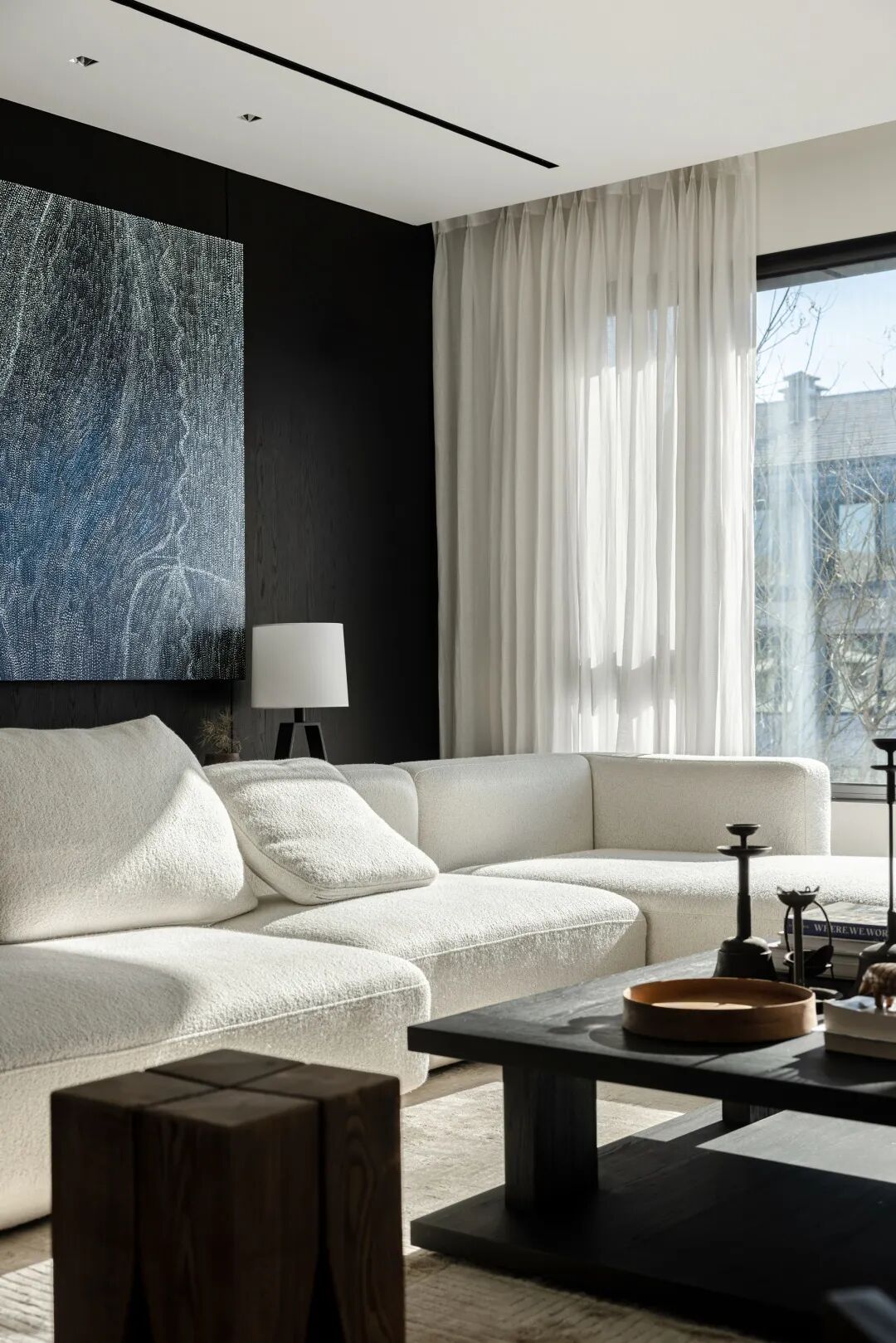 眼睛定格在背景墙上的画,那一抹静谧的蓝打破以黑白为主的空间,如川流缓缓涌动,人仅仅是注视着那一抹蓝,便能感受到平静。