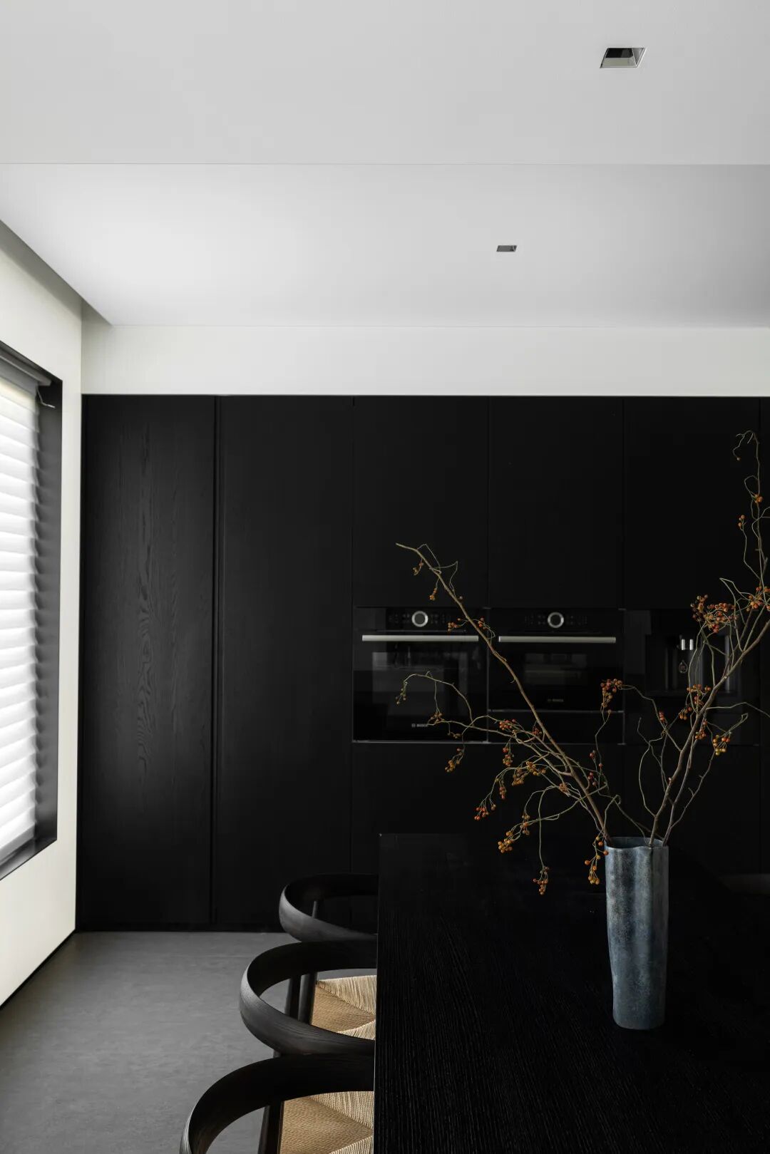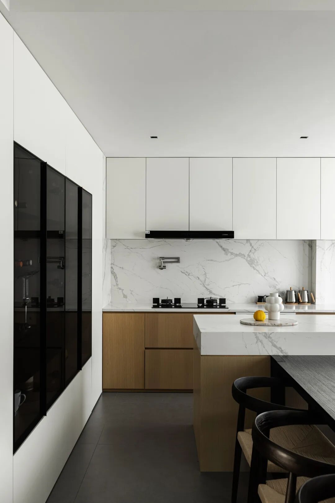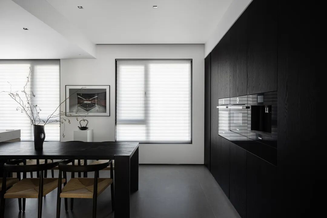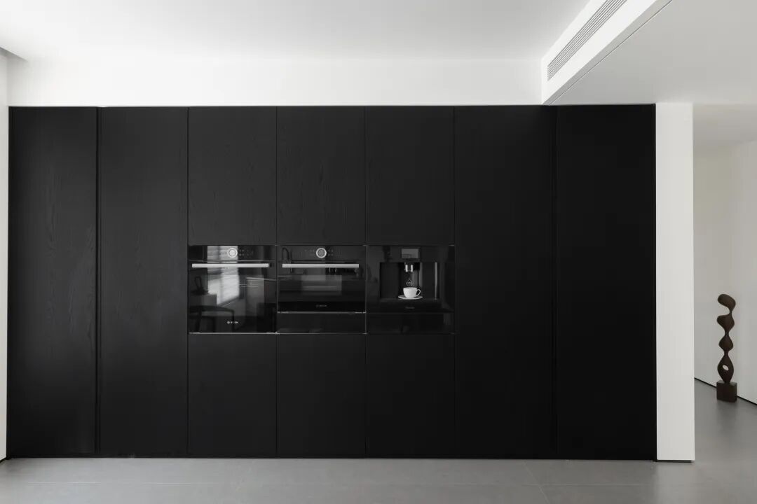 开放式厨房黑白分明,设计师以线条、光线、结构的干净配比,表达空间的一致性与纯粹性,在保证功能最大化的同时,创建和谐的美感。