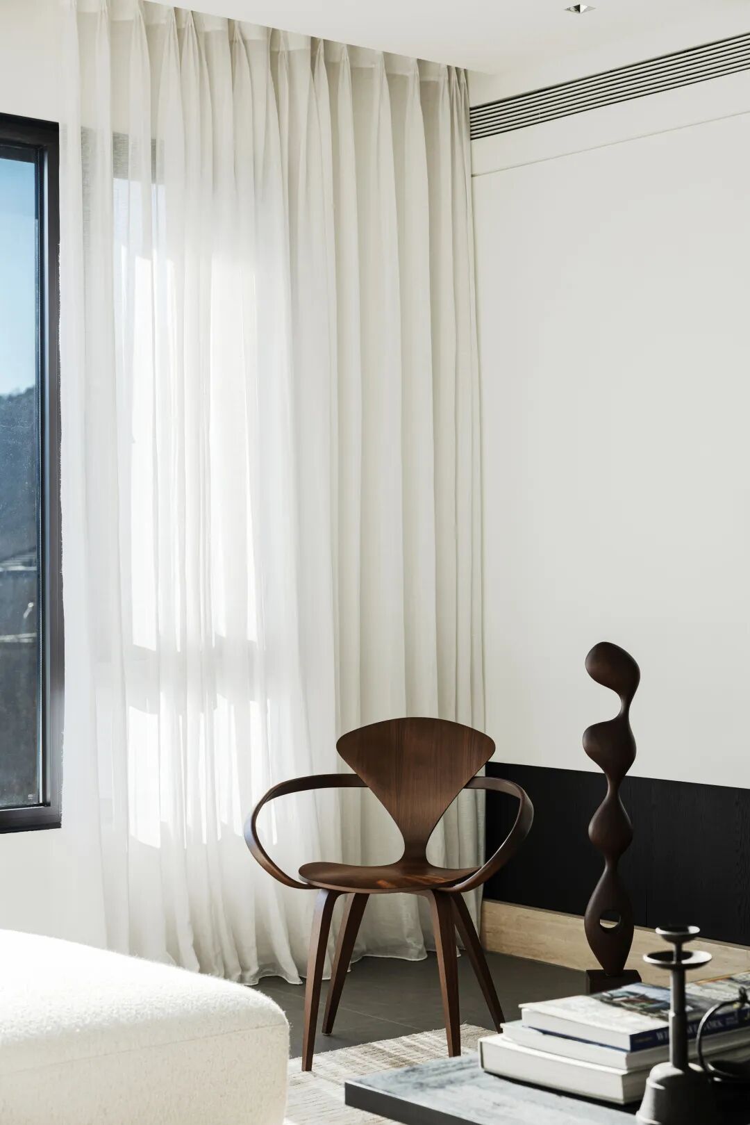 接纳从身体内部而来的情绪体验:风吹动纱帘,与纯白沙发轻轻摩擦,只有将耳朵打开,才能发现这温柔的低语;阳光穿透玻璃,倾洒在宽敞的室内,原本明亮的居室被赋予了更多暖意,此时此刻,身体被无限关照,户外自然的气息与屋内灵动的氛围由此贯穿全屋。