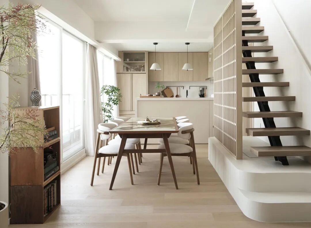这种布置也可以延伸到一个狭窄的阳台上,通过折叠式庭院门连接起来,进一步扩大了人们对家庭的视觉感知。客厅的顶峰也通过入口共享,展现了一个更加简单和私密的环境,让人们可以通过最少的娱乐设备来专注于休息和工作。