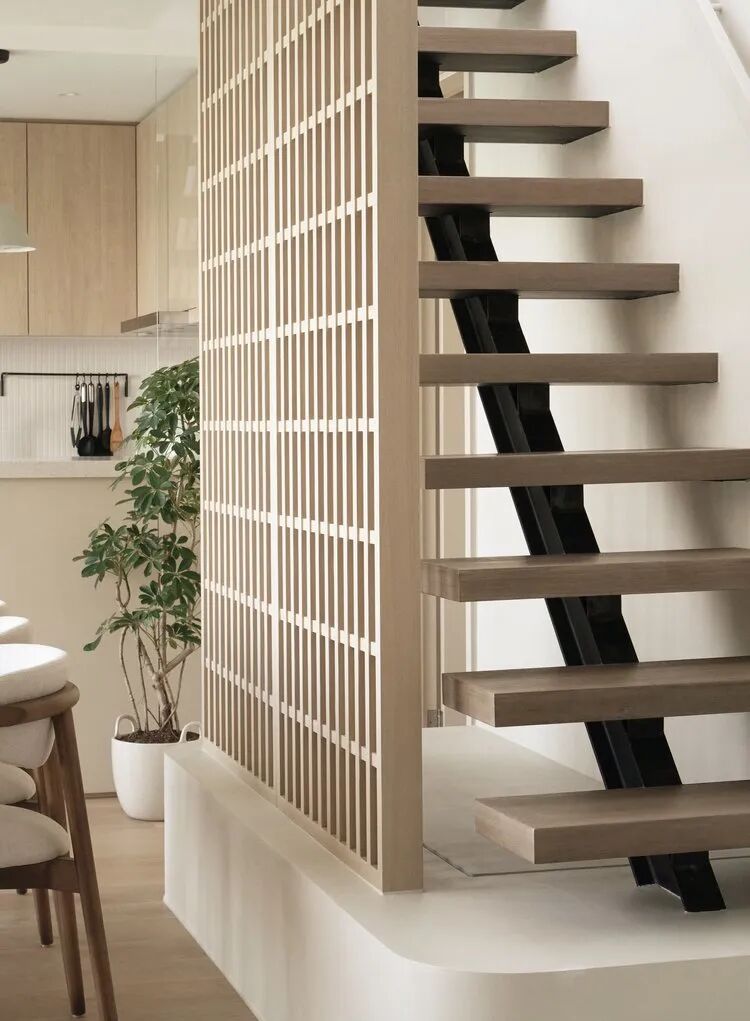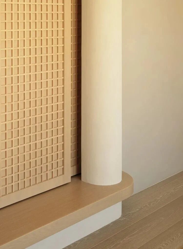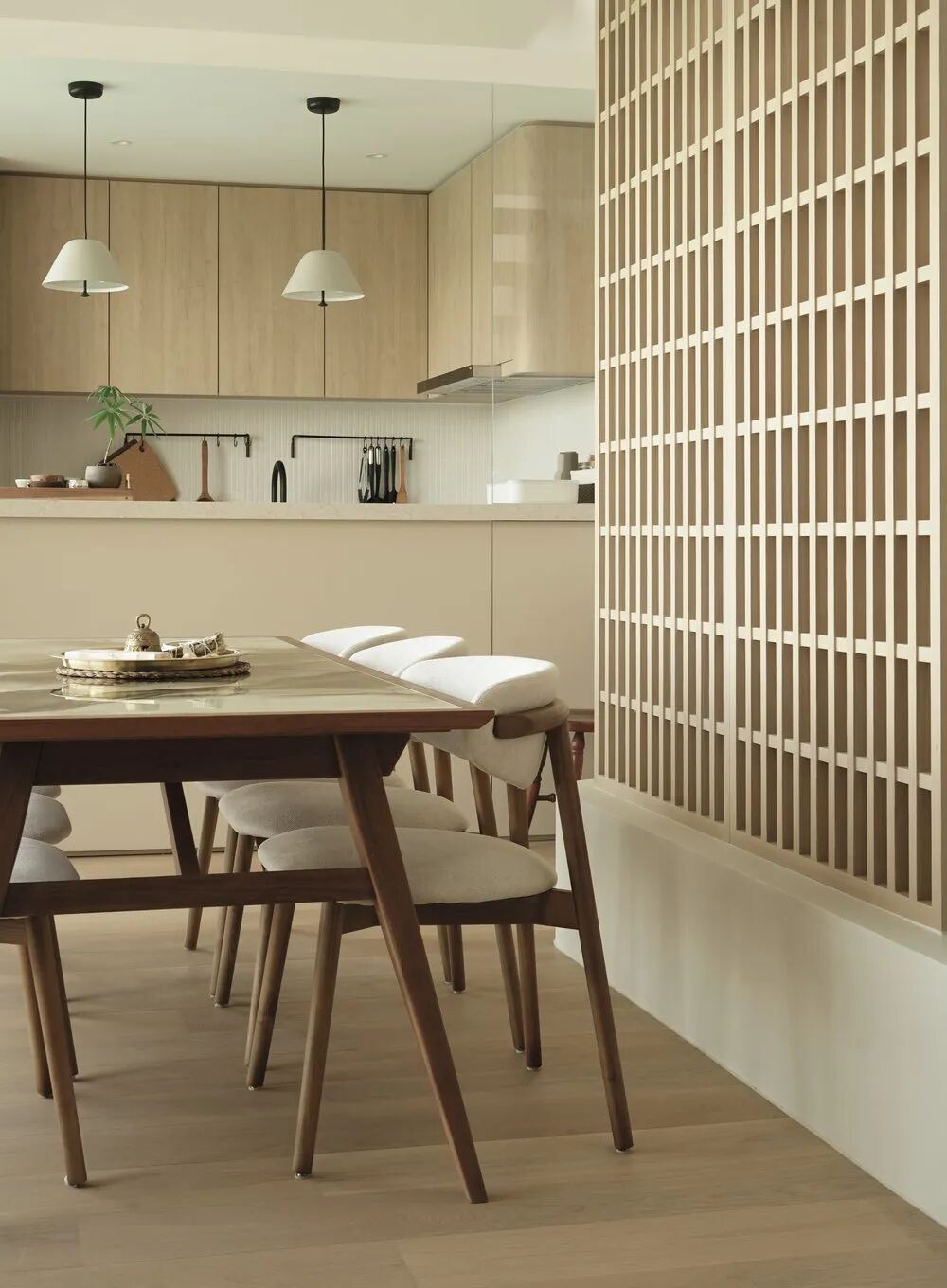 透气的木质格栅,保证了空间的划分,同时不必纠结采光的困扰,空间光影更为通透、灵动。