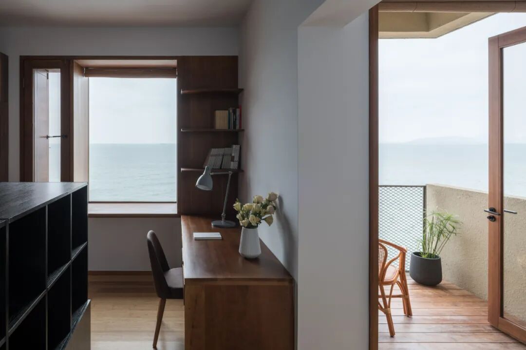 这道活动的“墙”的上方,是一条横贯空间的水平海景视窗,成为整个空间看海的焦点。