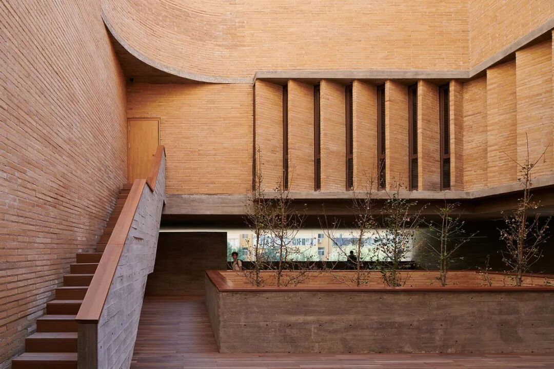 中庭空间使用红砖为主要材料围合,正如建筑大师路易斯康所说:“建筑师的职责是让每一块砖头,回归到它自己的位置。建筑师不是在圆自己的梦,而是在帮助砖头完成它们的梦想。”