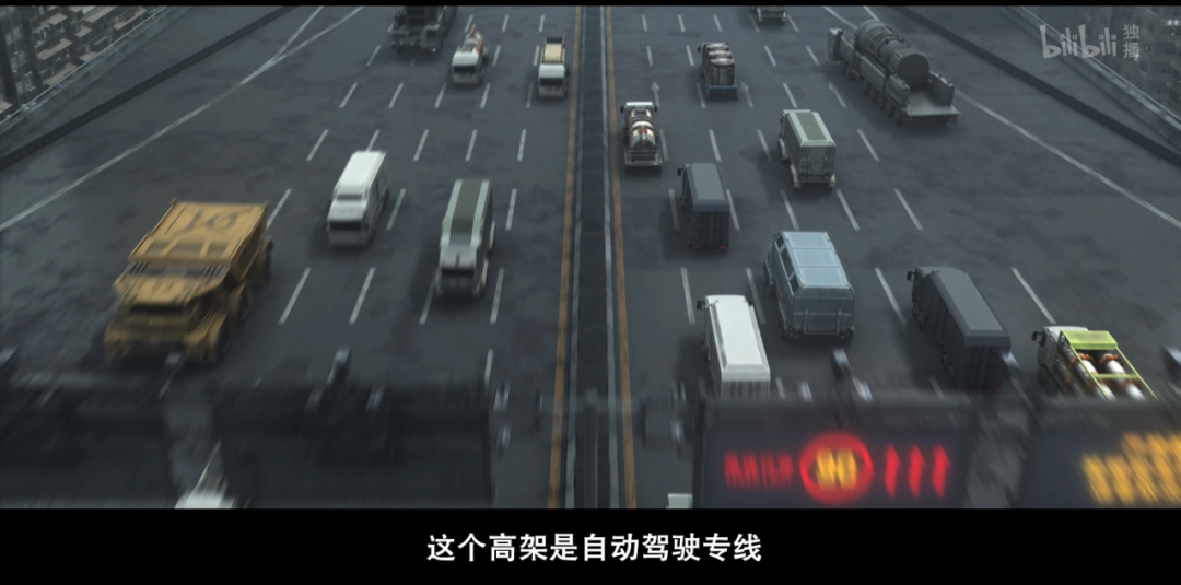 这里史强带着罗辑上了一条自动驾驶专线,从车型来看,应该是货运专线。