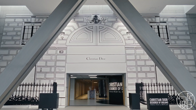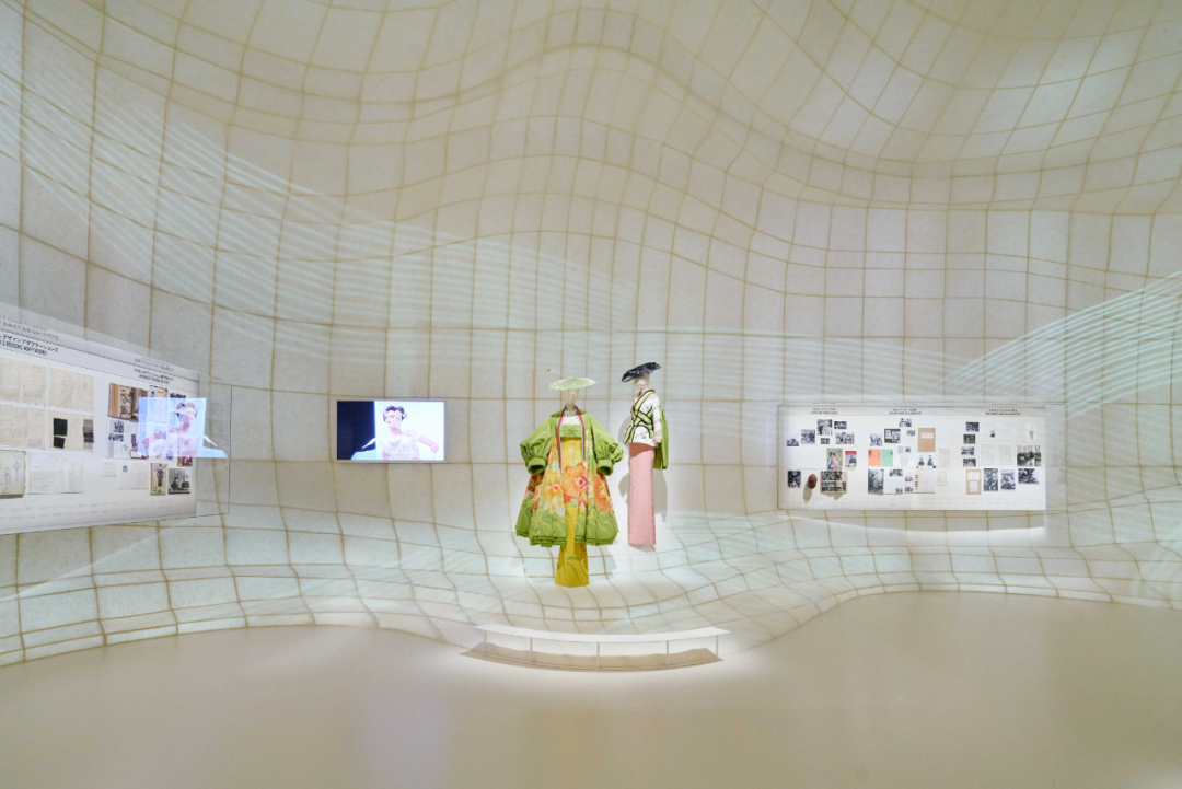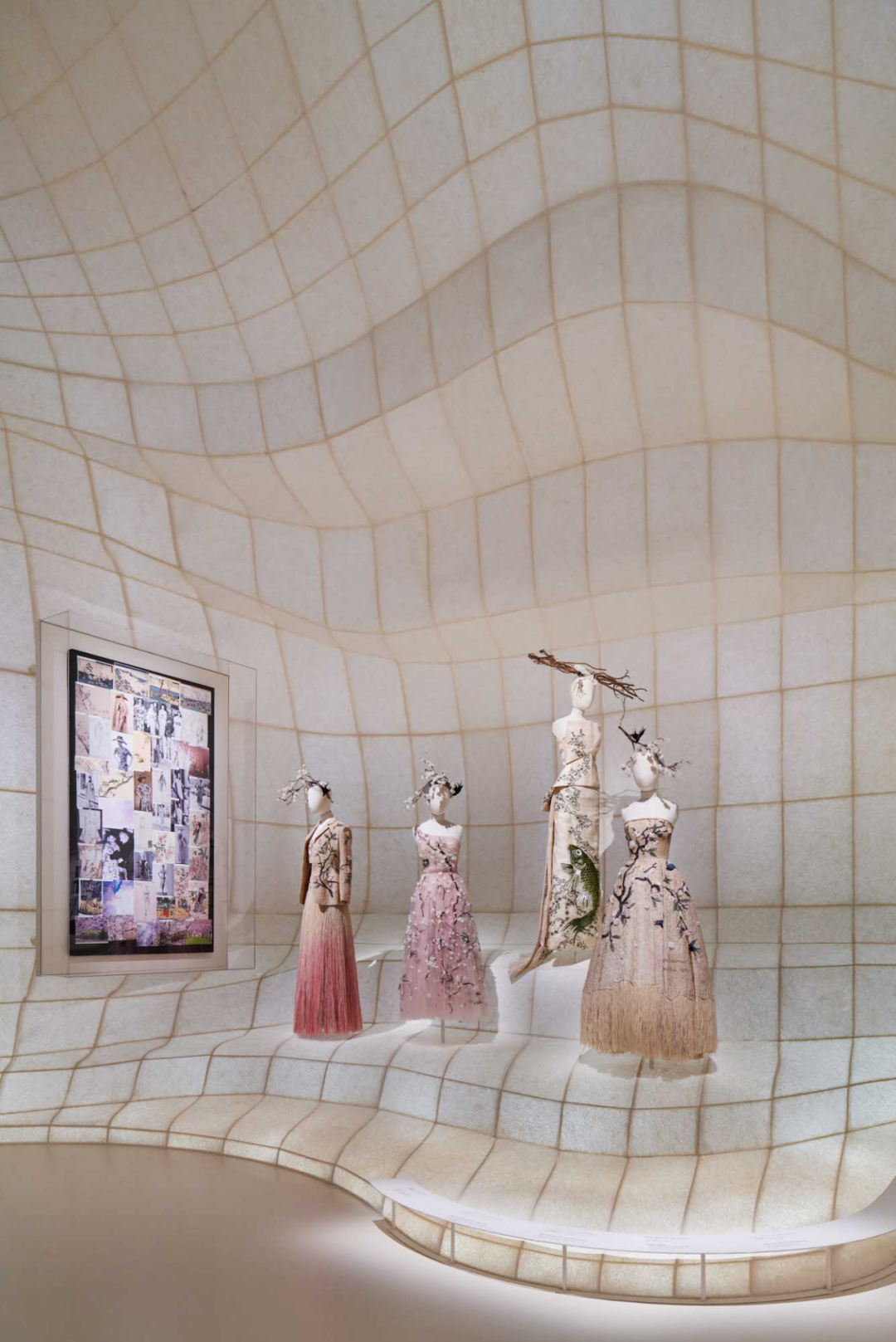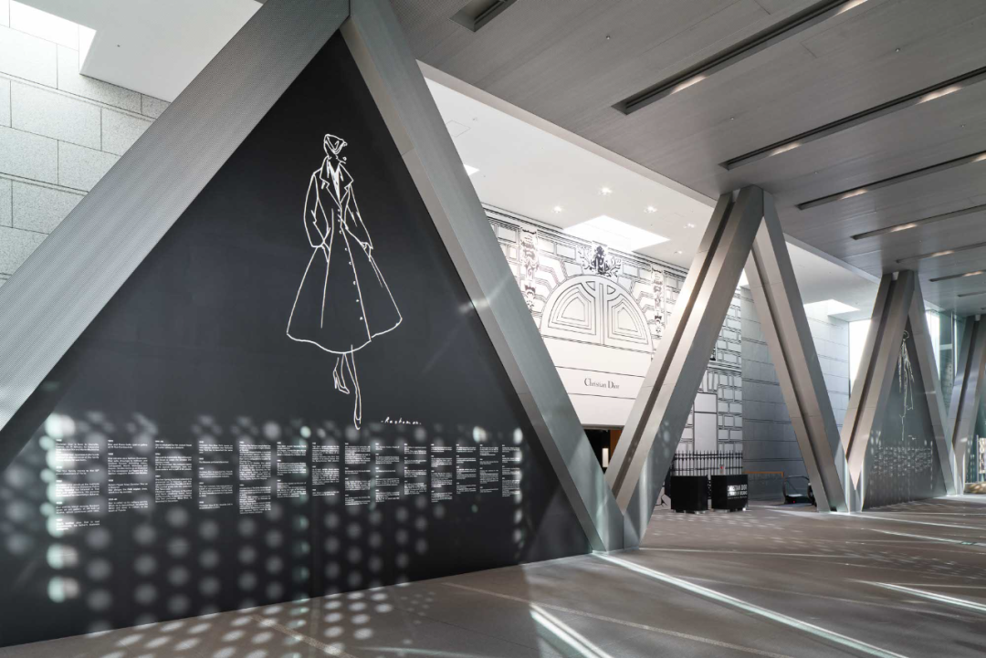 在讲述 Dior 传奇故事的区域,放大的织物面板让人联想到传统的 fusuma 和 Sudare 挂板。
