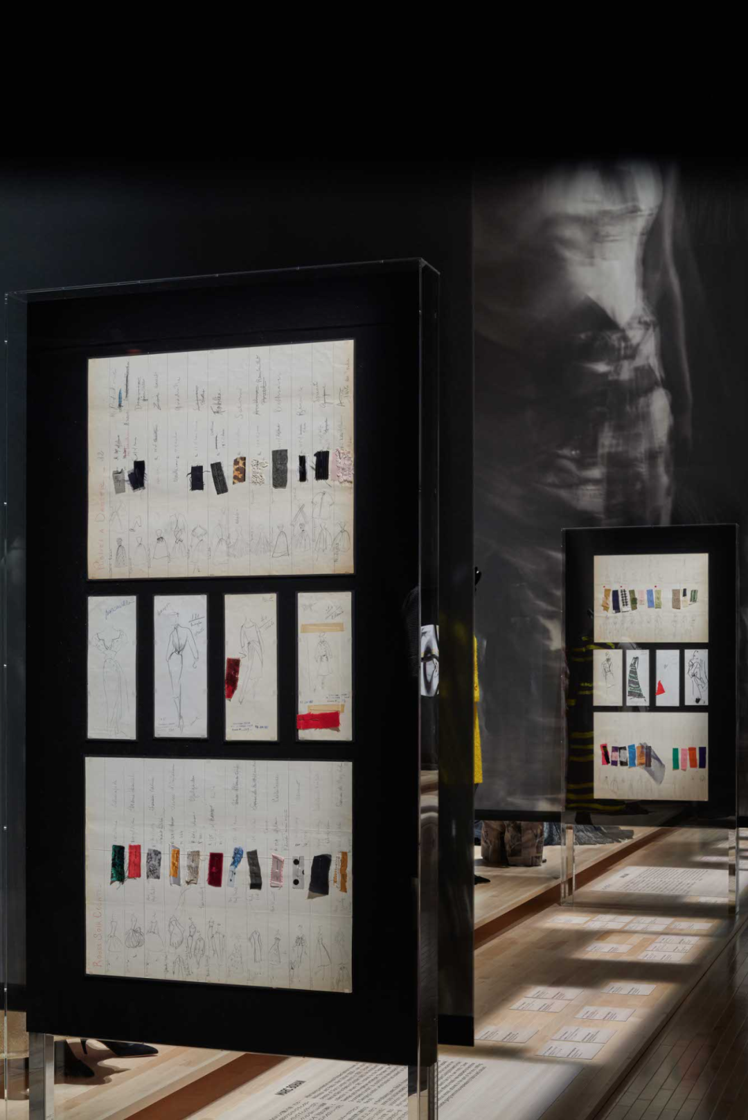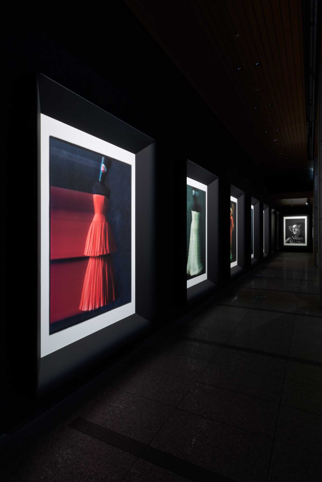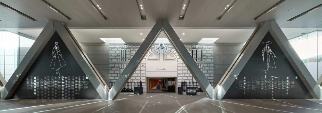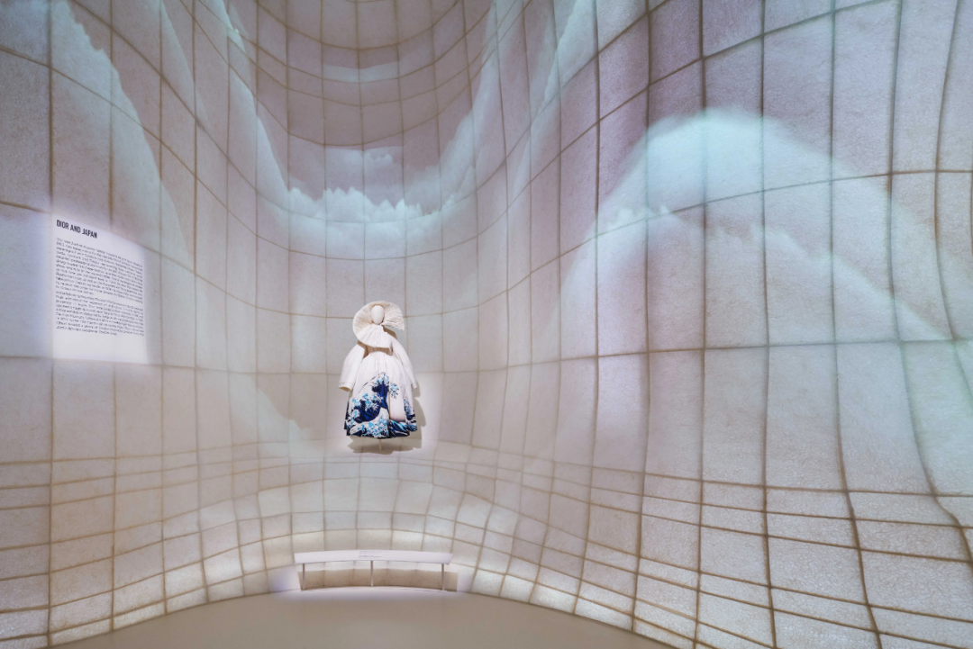 在讲述 Dior 传奇故事的区域,放大的织物面板让人联想到传统的 fusuma 和 Sudare 挂板。