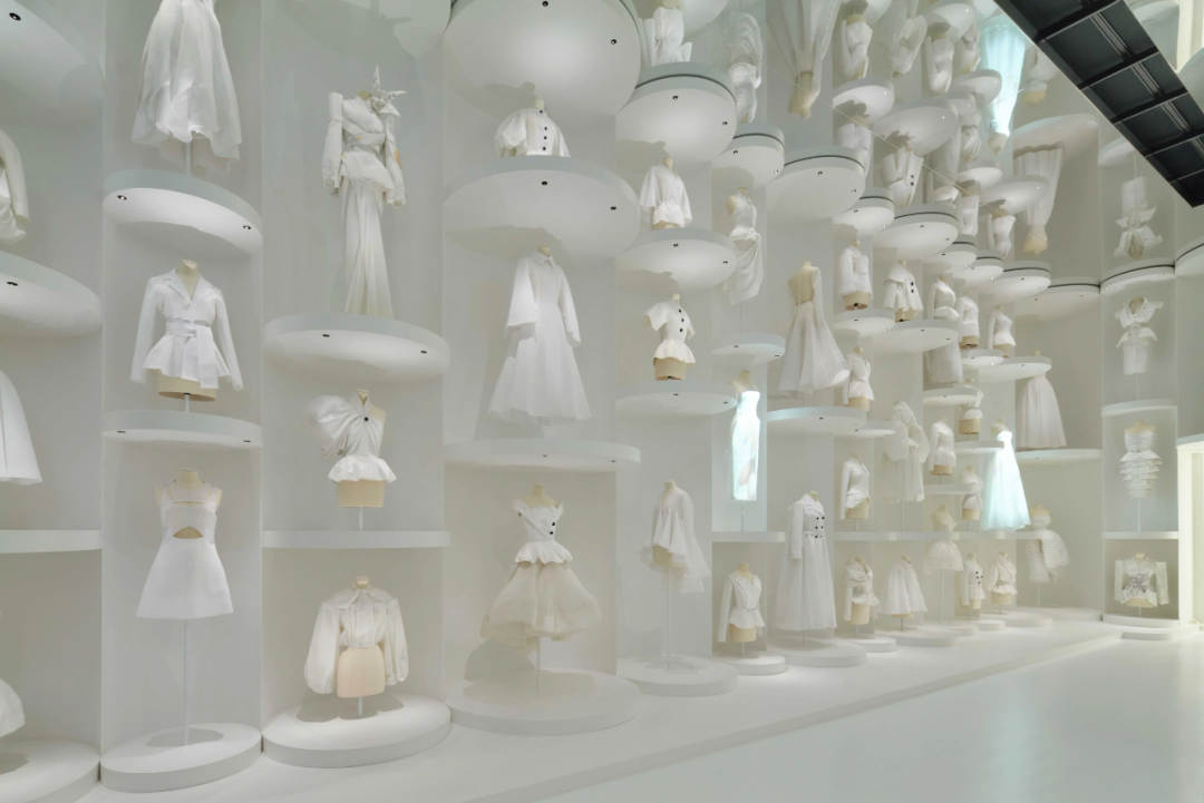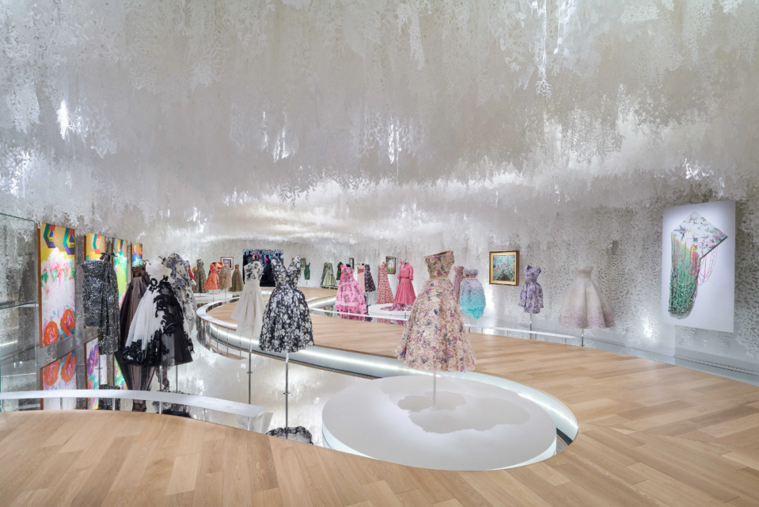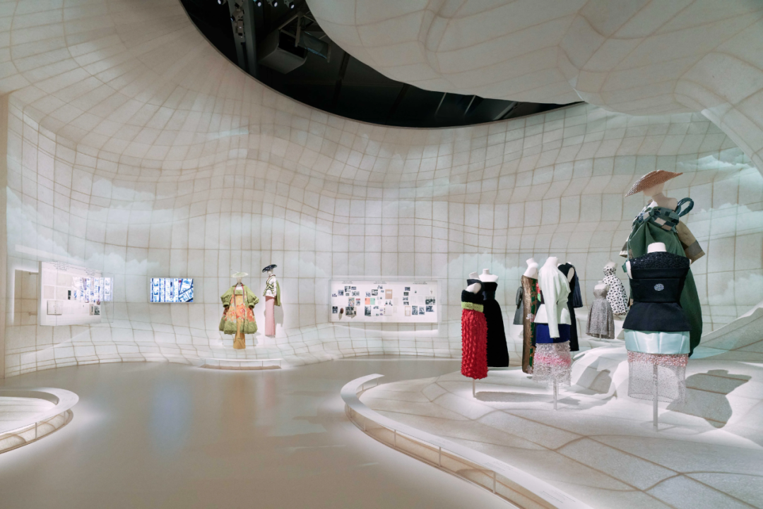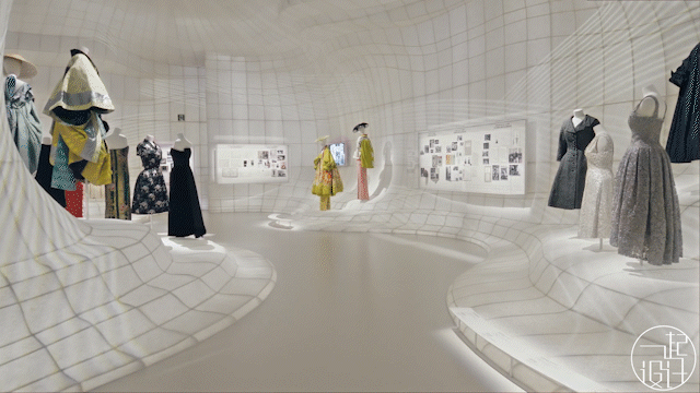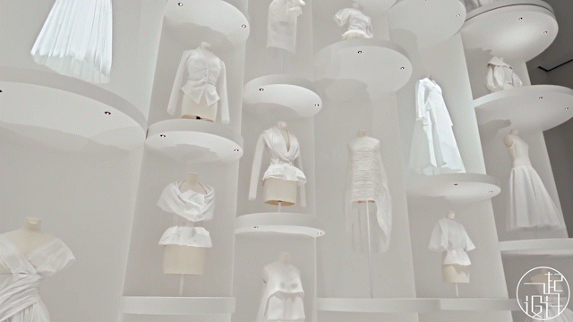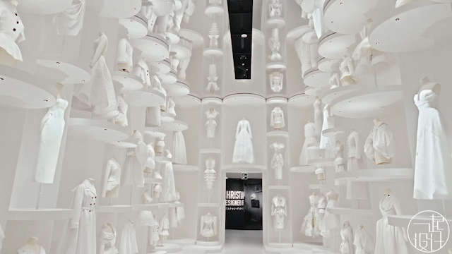 迪奥的工作室「ディオールのアトリエ」以白色作为该展厅的主打色,这里将展出 350 件高级定制礼服,其中包括旨在向日本文化致敬的礼服。