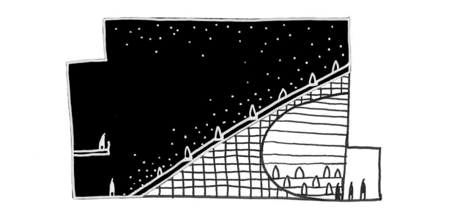 过道处以黑灰色调为主,统一倾斜的「折叠」中段位置悬挂着各种照片。