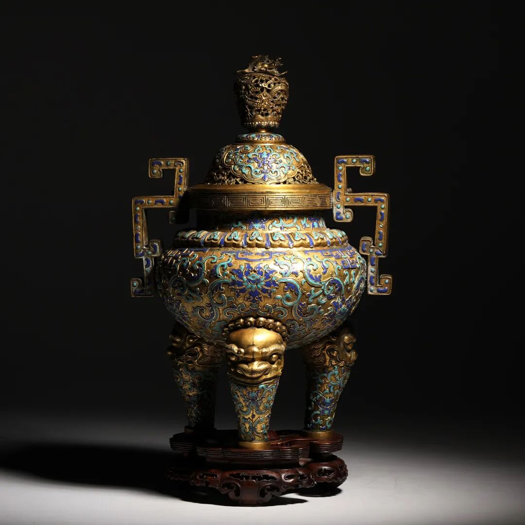 清乾隆 铜胎填珐琅龙钮三兽足大香炉